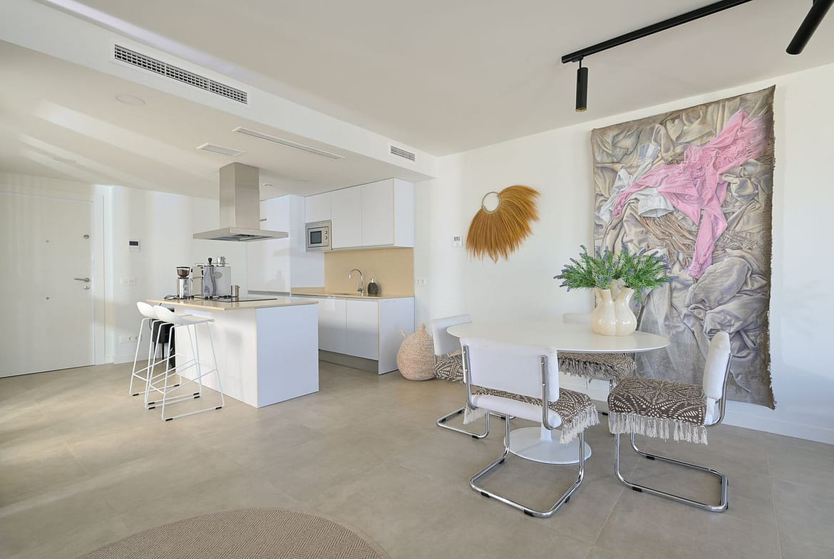 Inside, natural light floods the open-plan living area where the elegant lounge, dining space and fully equipped designer kitchen blend seamlessly together. Floor-to-ceiling sliding doors open onto a spacious terrace overlooking the Mediterranean — a front-row seat to spectacular sunrises and moonlit evenings.