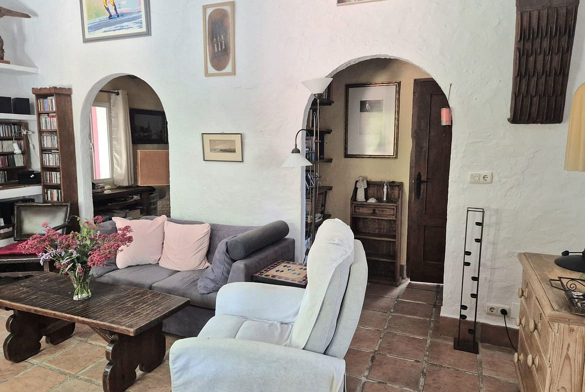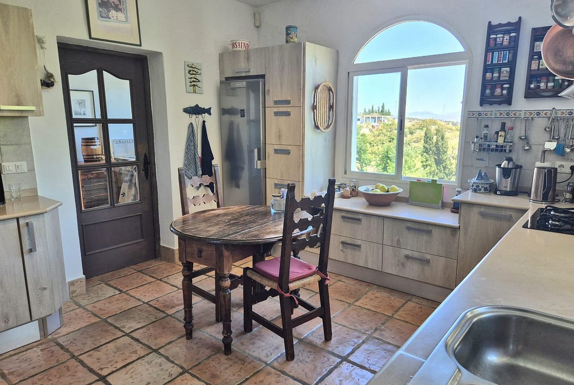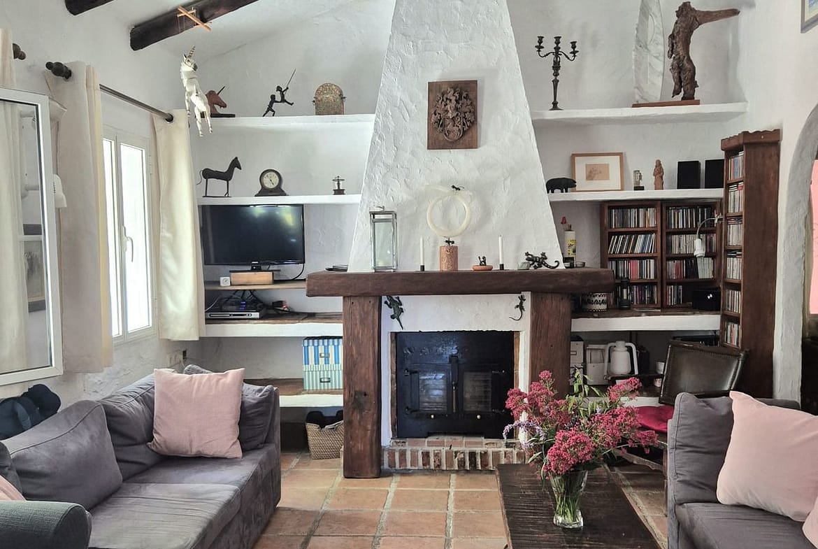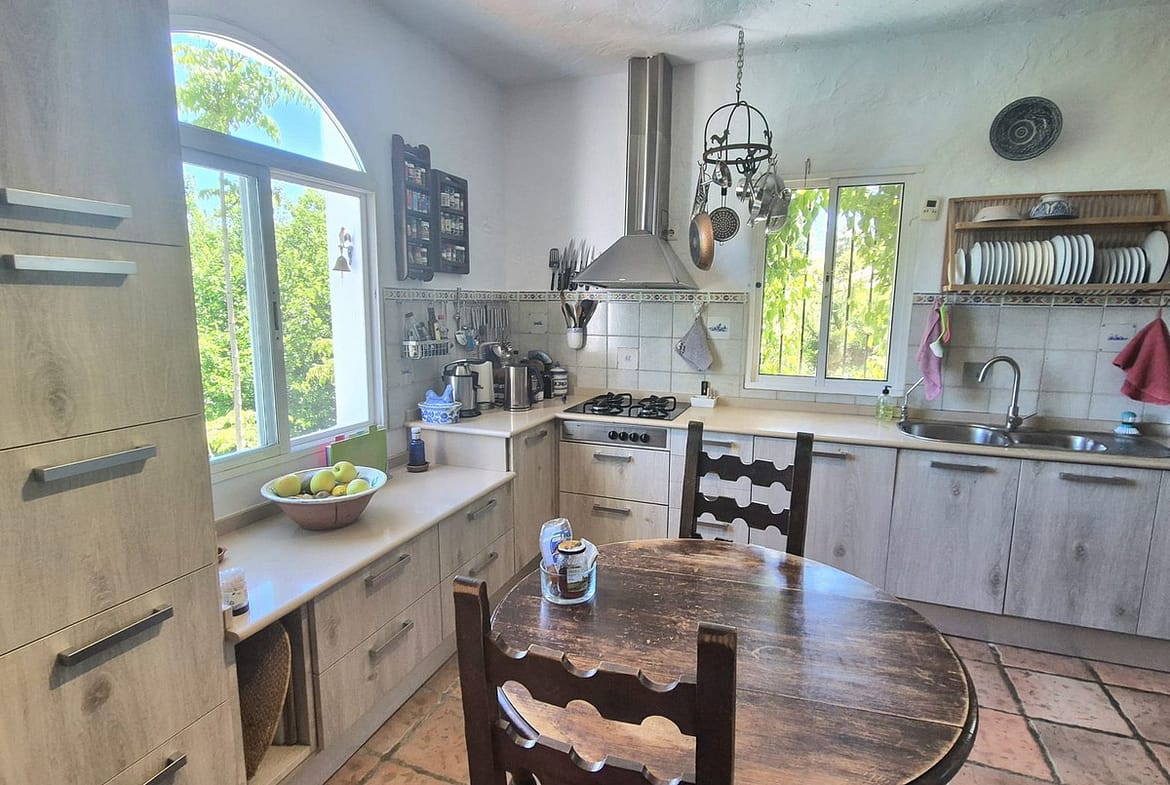 The main house consists of one floor, it has a mudroom upon entering the property for your shoes and coats, living room with fireplace and nice high ceilings. There is a separate dining room to the right of the living room and from here you enter the fully fitted kitchen you have amazing views from the window above the sink. There is a pantry / laundry area off the kitchen and it leads to a terrace where from here you can access the spiral stairs up to the roof terrace where i one solar panel that gives back to the grid. Back down into the dining room you can reach the master bedroom this also accesses the terrace, you have ample fitted wardrobes, a wood burning fireplace, air conditioning unit and you have the en suite bathroom with a bath / shower combi. Coming back into the living room you have another full bathroom with shower, a study / office and the 2nd bedroom. The main house has underfloor heating. Underneath the main house is a guest studio apartment of 51m2, fitted with a separate kitchen, bathroom, living area with bedroom, you have a wood fireplace here and lovely and cool in the summer. You have a large storeroom near the property, which could be changed into more accommodations as well as more storage adjacent to the property on the other side which you can convert into the main property.