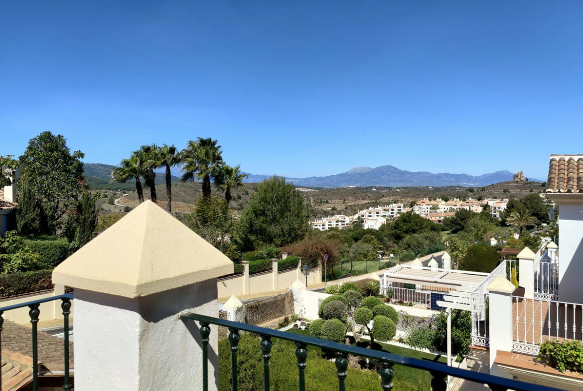 Semi-detached house in Alhaurín Golf urbanization, with beautiful panoramic views of the countryside. Main floor with: entrance hall, living-dining room with fireplace and access to a west-facing garden terrace with Jacuzzi, full bathroom with shower, large and fully equipped kitchen and access to a porch with barbecue and a rear garden with tropical plants, swimming pool and orientation East. Upper floor, has 3 large bedrooms, the master bedroom with terrace, beautiful views and bathroom en suite. Two large bedrooms and a bathroom with shower. The urbanization is residential, quiet, with a fantastic golf course and golf club with bar, restaurant, where you can enjoy beautiful views.