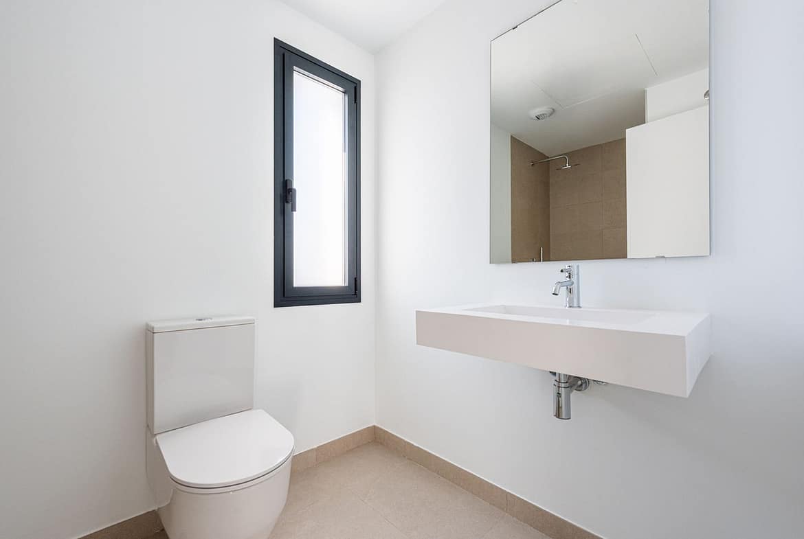 The home features three generously sized bedrooms on the upper level, along with two full bathrooms designed for both functionality and style. The ground floor welcomes you with a bright and airy living area, a guest toilet, and seamless access to the outdoor spaces. Large windows enhance the sense of space and connect the interior with the exterior, allowing natural light to flow throughout the home. From the living area, you step directly onto the terrace and into your own private garden — an ideal space for outdoor dining, children’s play, or simply enjoying the Mediterranean climate in complete privacy.