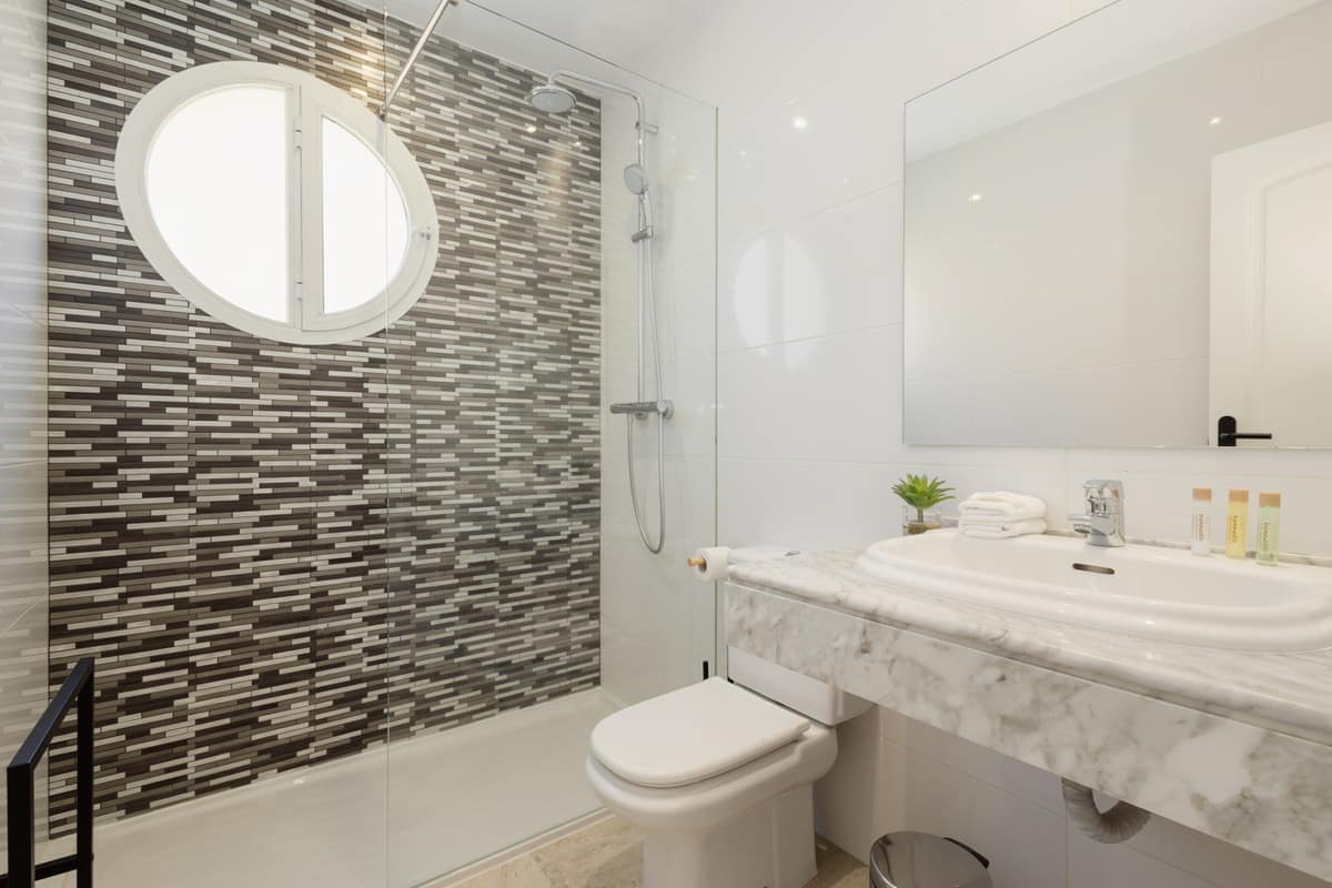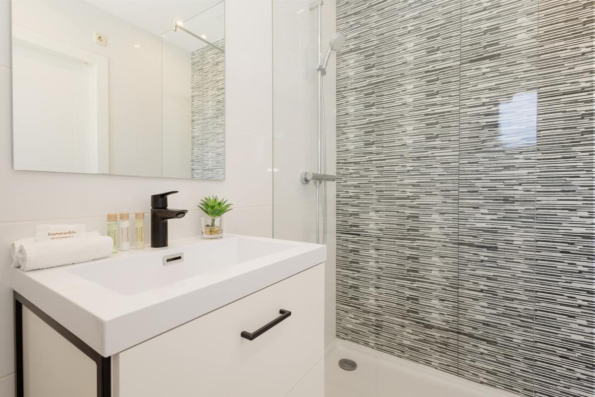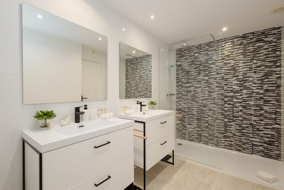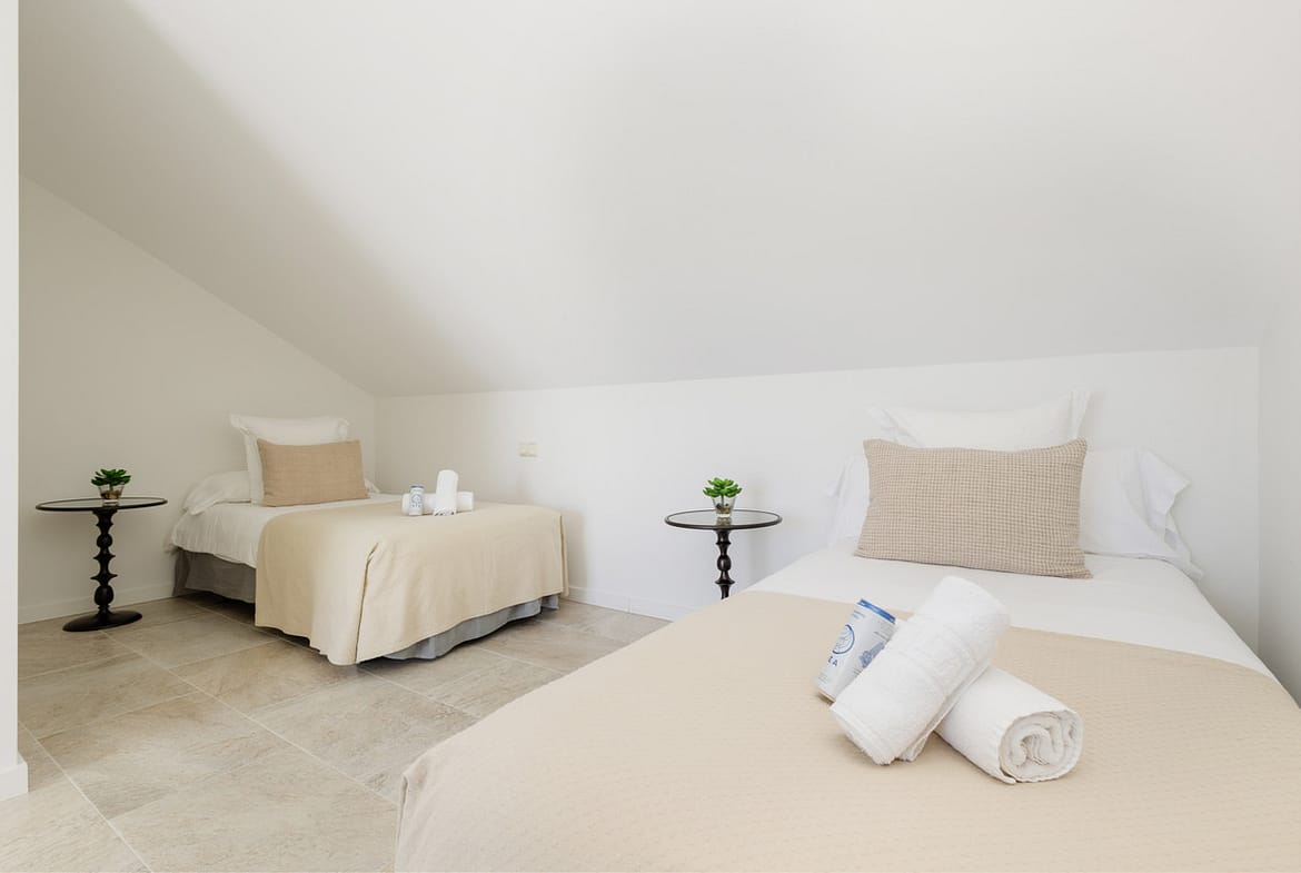 The second bedroom on the same floor has 2 single beds of 90×200 and also an en-suite bathroom with shower, washbasin and toilet.
