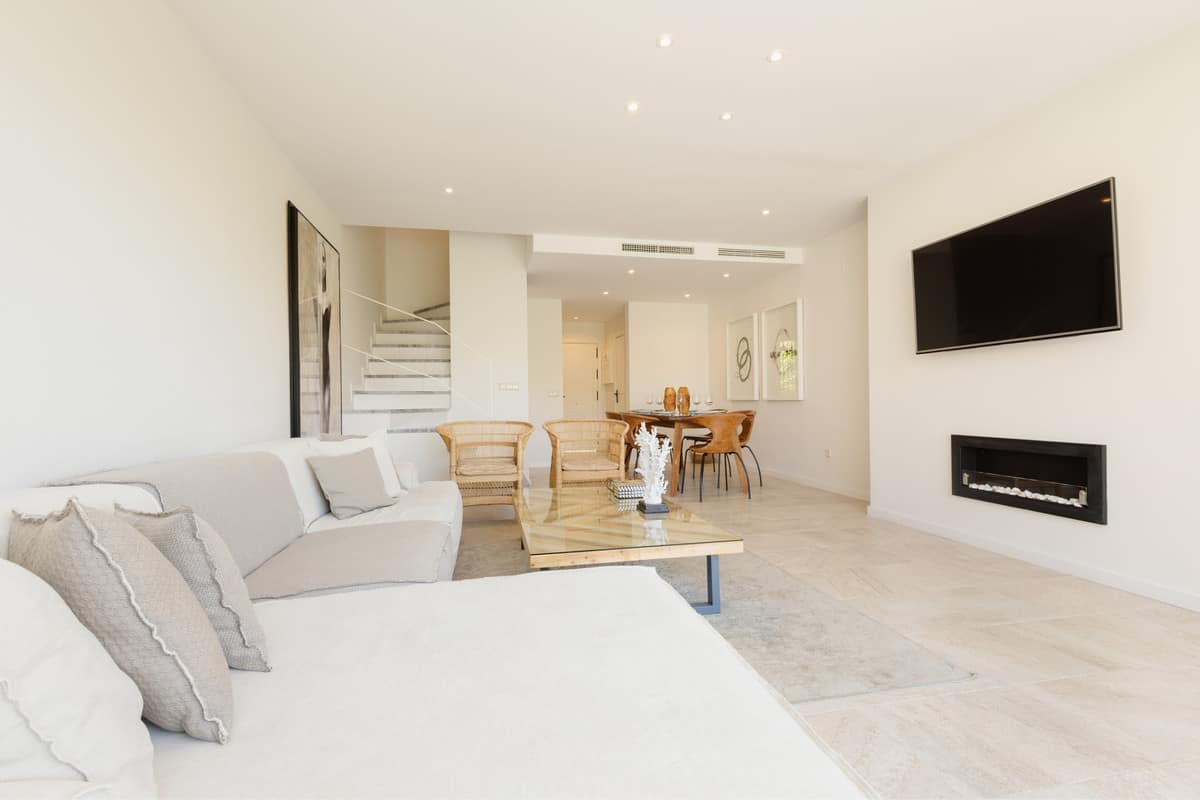 Welcome to our modern family holiday home, with 3 bedrooms, 4 bathrooms, located in a complex of front line beach houses with communal swimming pools and 24 hour concierge. Located in the urbanization Bahia de Marbella, close to golf courses such as Santa Clara or Rio Real, restaurants, 5 minutes from Marbella centre and the old town and only 12 minutes from Puerto Banus.