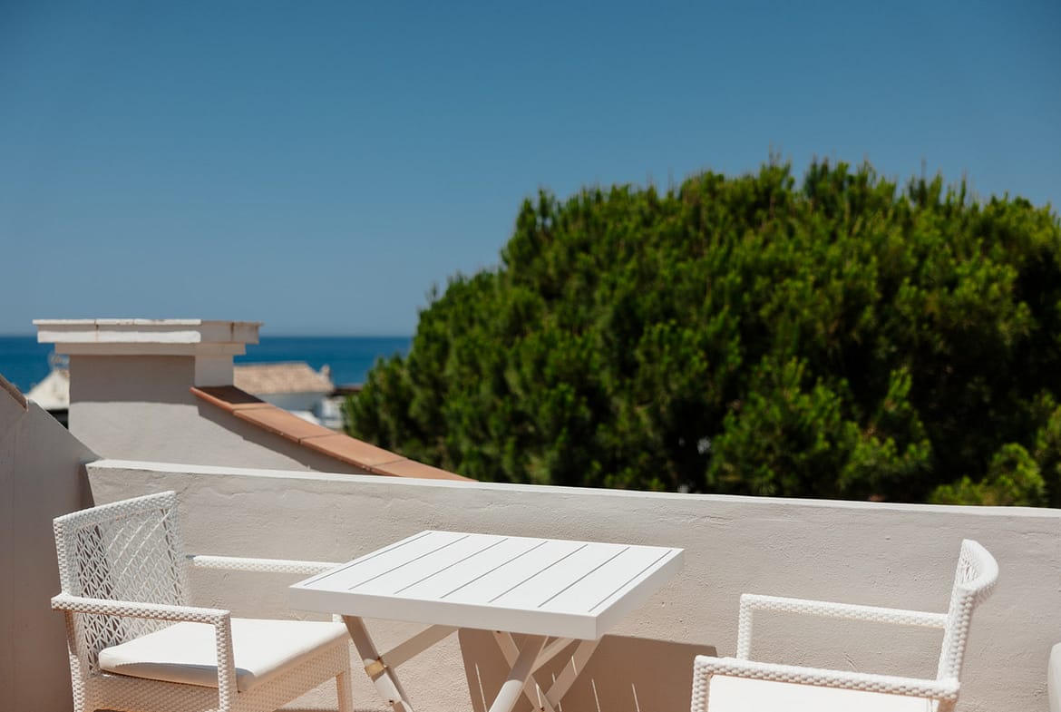 The upper level houses a third bedroom with en-suite bathroom and a double bed. But its main attraction is undoubtedly a private terrace offering unparalleled views of the sea, perfect for relaxing on the sofa or at the table with chairs.