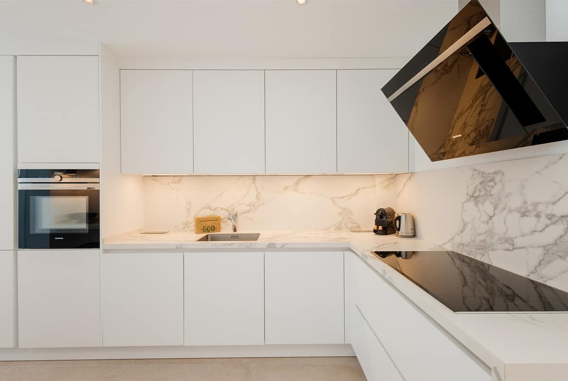 The fully modern, open-style kitchen is fitted with white marble and top-of-the-line appliances: ceramic hob, extractor hood, oven, microwave, fridge, dishwasher, toaster, kettle, and Nespresso coffee machine. It’s also equipped with all necessary kitchenware: dishes, cutlery, glasses and cookware.
