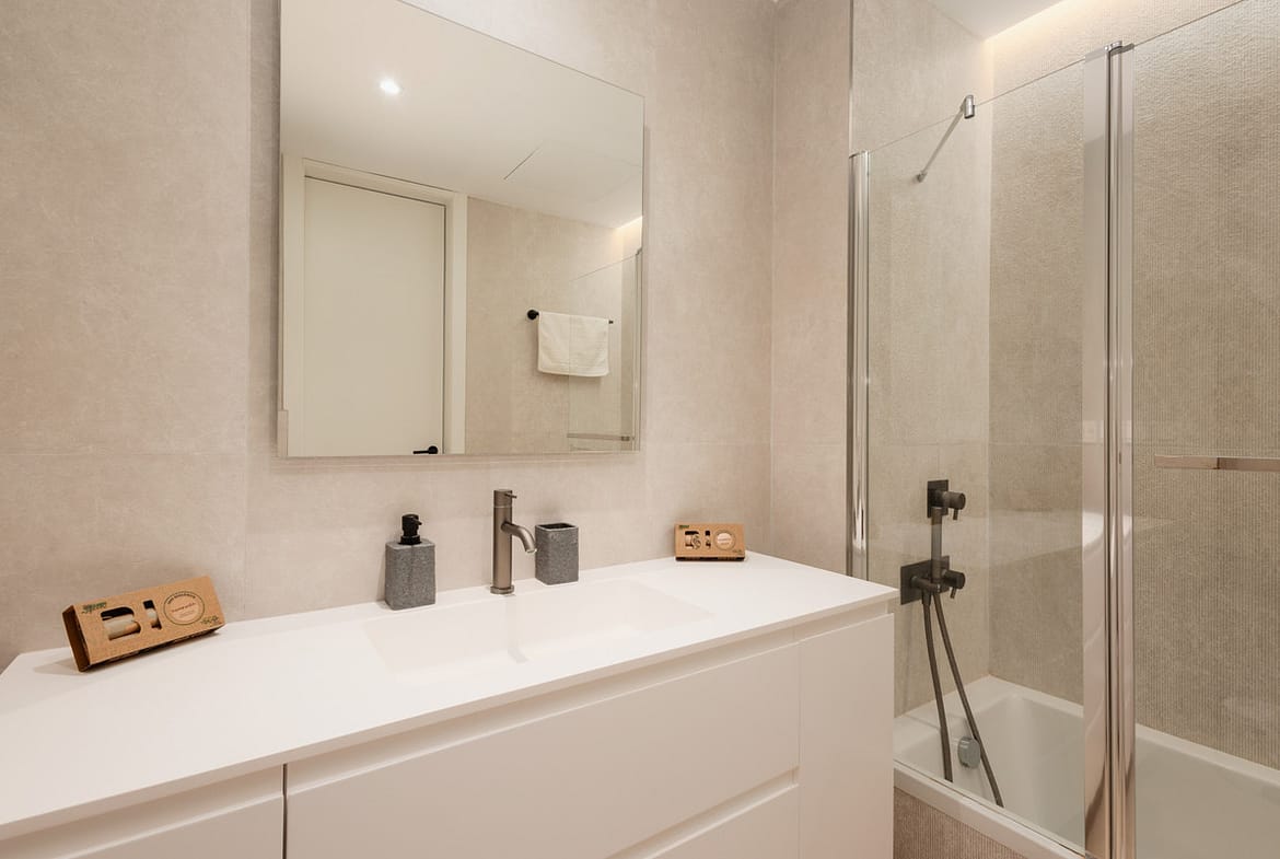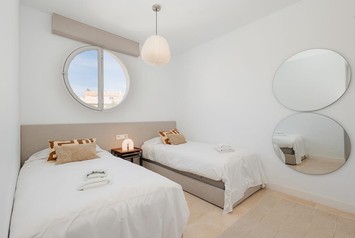 The second bedroom has a king-size bed, built-in wardrobe and pool views. The third bedroom includes two single beds. The second bathroom has a single sink and a spacious bathtub — ideal for relaxing after a beach day or outdoor adventures.