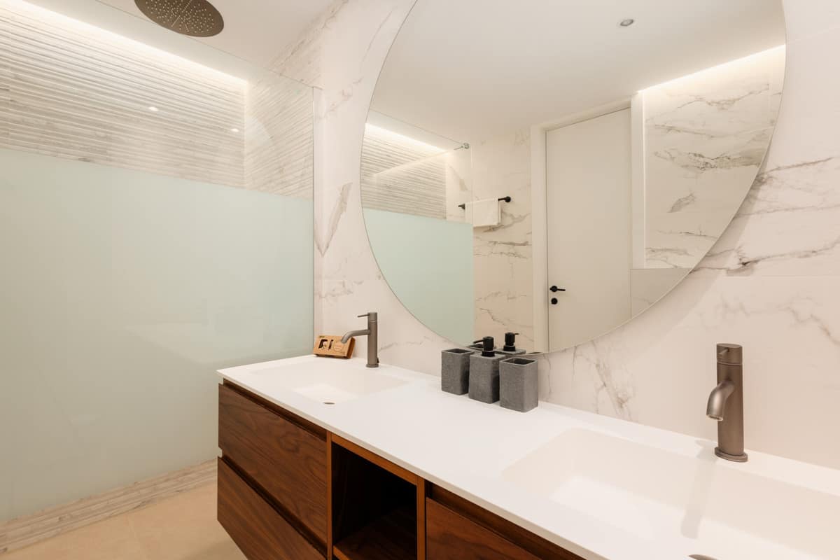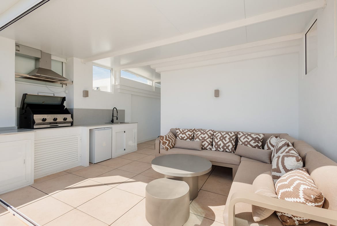The third floor is entirely dedicated to leisure and offers enviable sea views. With over 45 m² of space, the solarium is partially covered with a retractable glass curtain. It includes a sunbathing area with loungers to enjoy Marbella’s 320+ days of sunshine per year, a chill-out corner with an L-shaped sofa and a coffee table to take in the best sunsets, and an outdoor kitchen with cupboards, sink, BBQ and grill — perfect for year-round use. On this floor, you’ll also find the washer and dryer.
