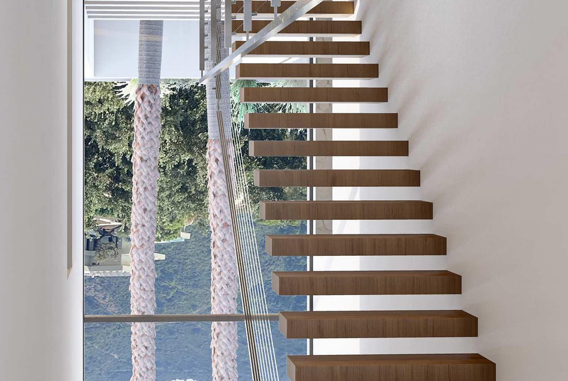 The villa features 3 en-suite bedrooms, a guest toilet on the main level, and an additional bathroom by the pool. On the upper level, there is space for a gym, a covered terrace, and an outdoor kitchen. A garage with capacity for 2 cars is located at the top of the villa. The high ceilings and floor-to-ceiling windows create a sense of spaciousness, allowing natural light to flow throughout the interior. The open-concept kitchen and bathrooms are fully equipped, and the home includes underfloor heating throughout.