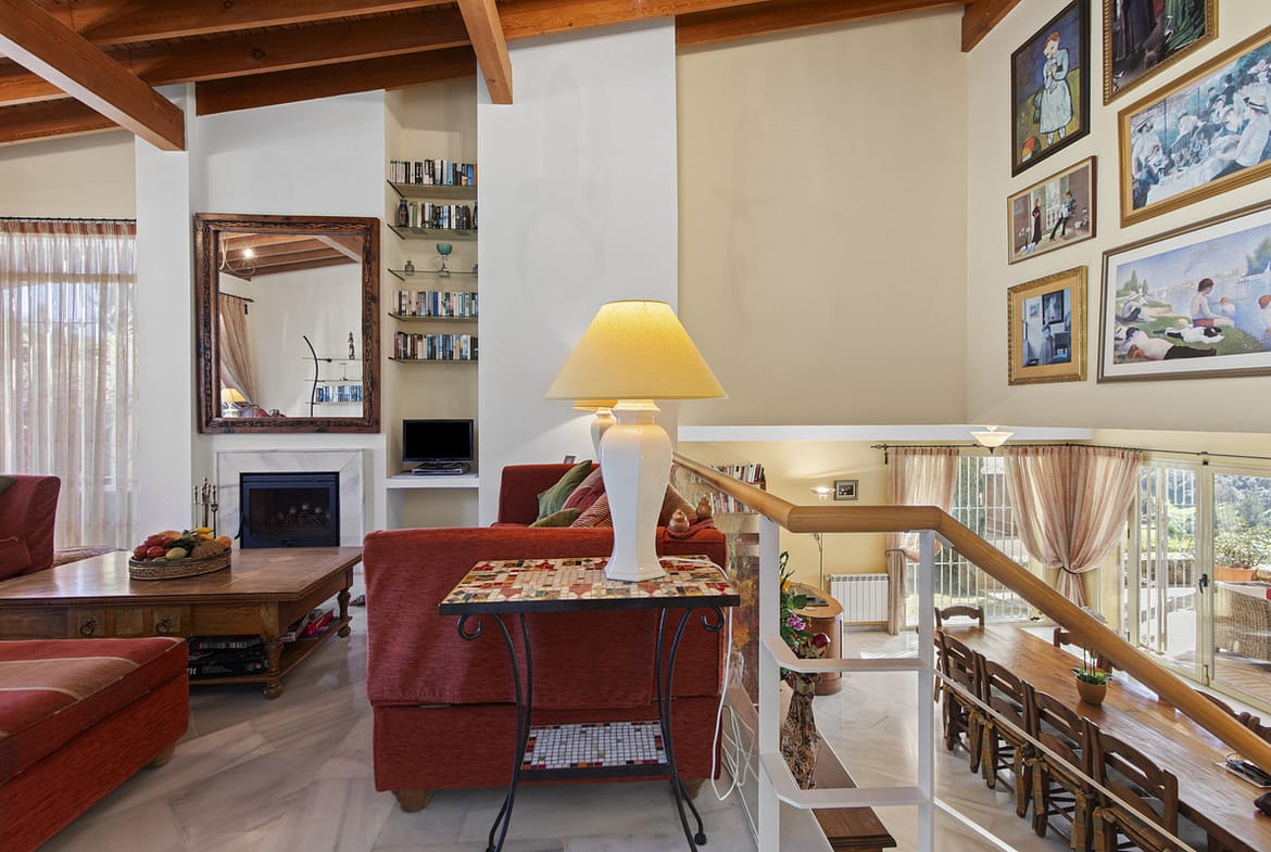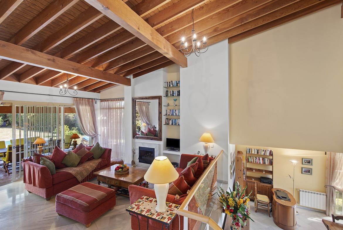 Inside, the living room features an impressive vaulted ceiling with a fireplace, creating a wonderful sense of space and warmth while enhancing the overall character of the home. Elegant marble floors run throughout, adding a timeless and refined finish.The villa also benefits from a large, well-appointed kitchen, offering ample workspace and storage, ideal for both everyday living and entertaining.