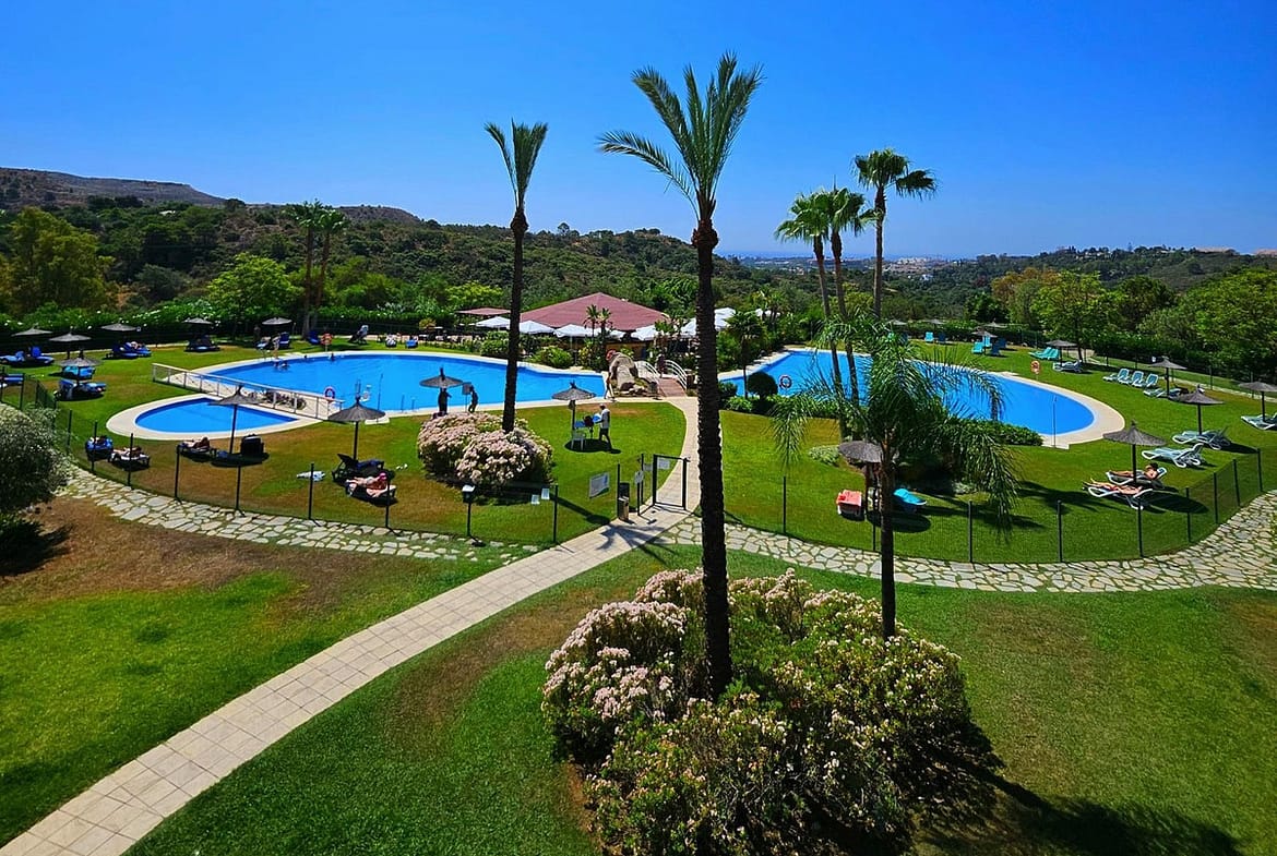 Residents enjoy an impressive array of country club amenities: gated entry with 24-hour concierge and security, three outdoor pools, one heated indoor pool, a fully equipped gym, indoor squash courts, sauna, steam bath, jacuzzi, tennis courts, football/basketball pitch, tropical gardens with fountains and fruit trees, a library, and a chiringuito for casual dining. This pet-friendly, well-maintained community also offers spa facilities, indoor and outdoor lounges, and superb recreational options like tennis and squash – all set in a tranquil, nature-inspired environment just 80 km from Malaga Airport.