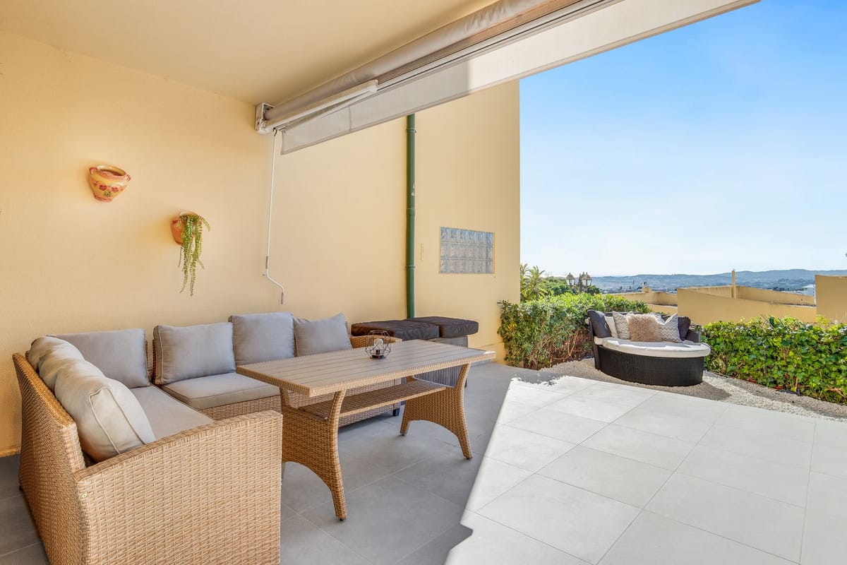 A spacious, west-facing terrace that enjoys afternoon and evening sun, with stunning views of Fuengirola.