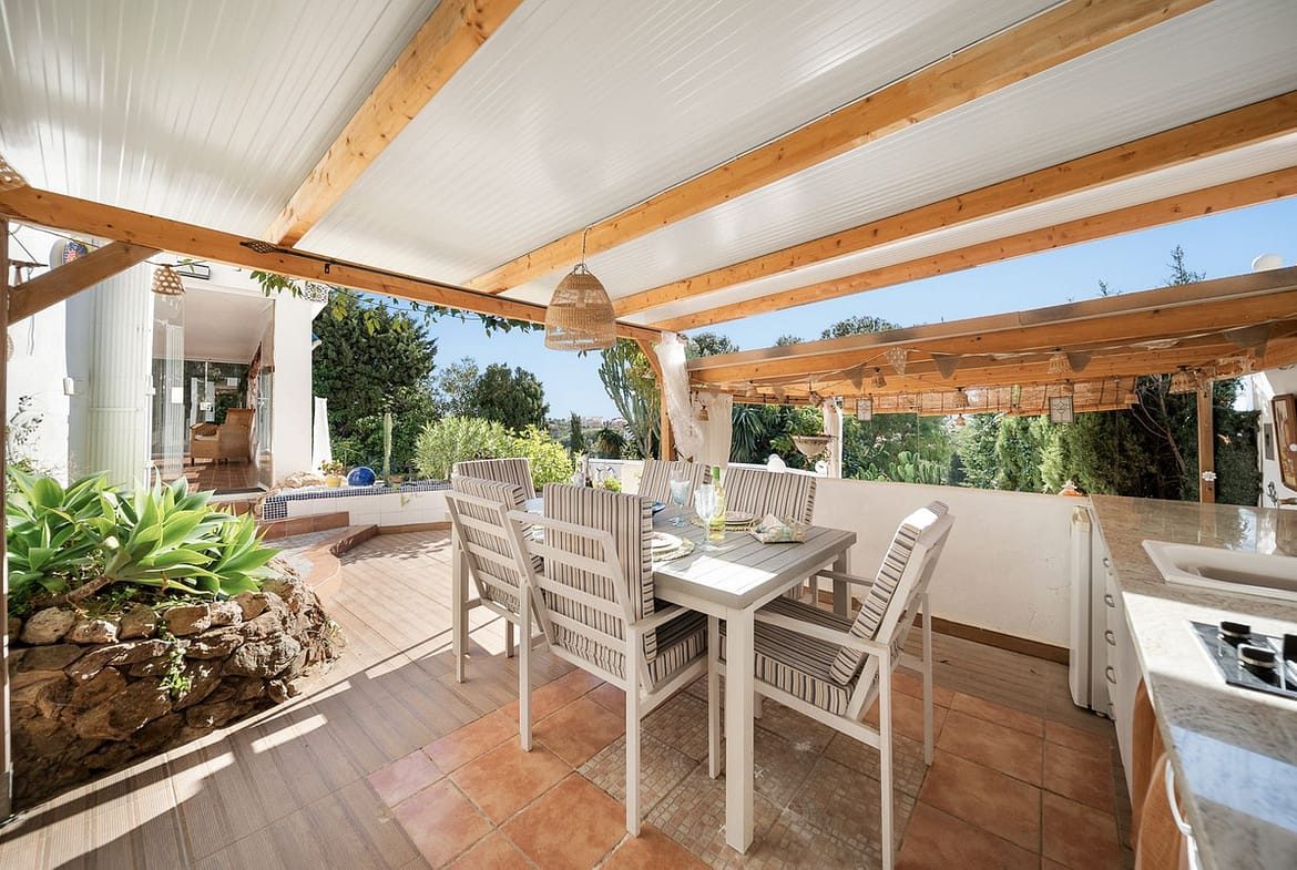 On the lower level, going down the staircase from the living room, the owners have created a self-contained living area. This space includes a third double bedroom, a bathroom/utility room, and an additional living room and conservatory with views of the pool, terraces, and garden. From here, you have direct access to the outdoor kitchen with a BBQ area and outdoor lounge, perfect for dining outdoors.