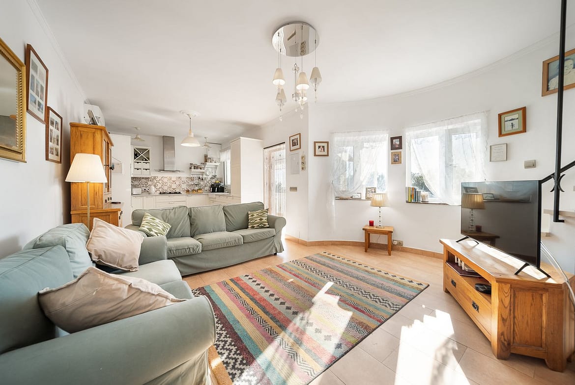On entering the house, you are greeted with a bright and spacious conservatory with a dining area, created by enclosing the terrace with glass curtains. This space offers stunning views and can be opened for al fresco dining in the summer or closed during the cooler months. From the conservatory, you enter the stylish living area and open-plan kitchen. There is a generously sized double bedroom with built-in wardrobes and a family bathroom.