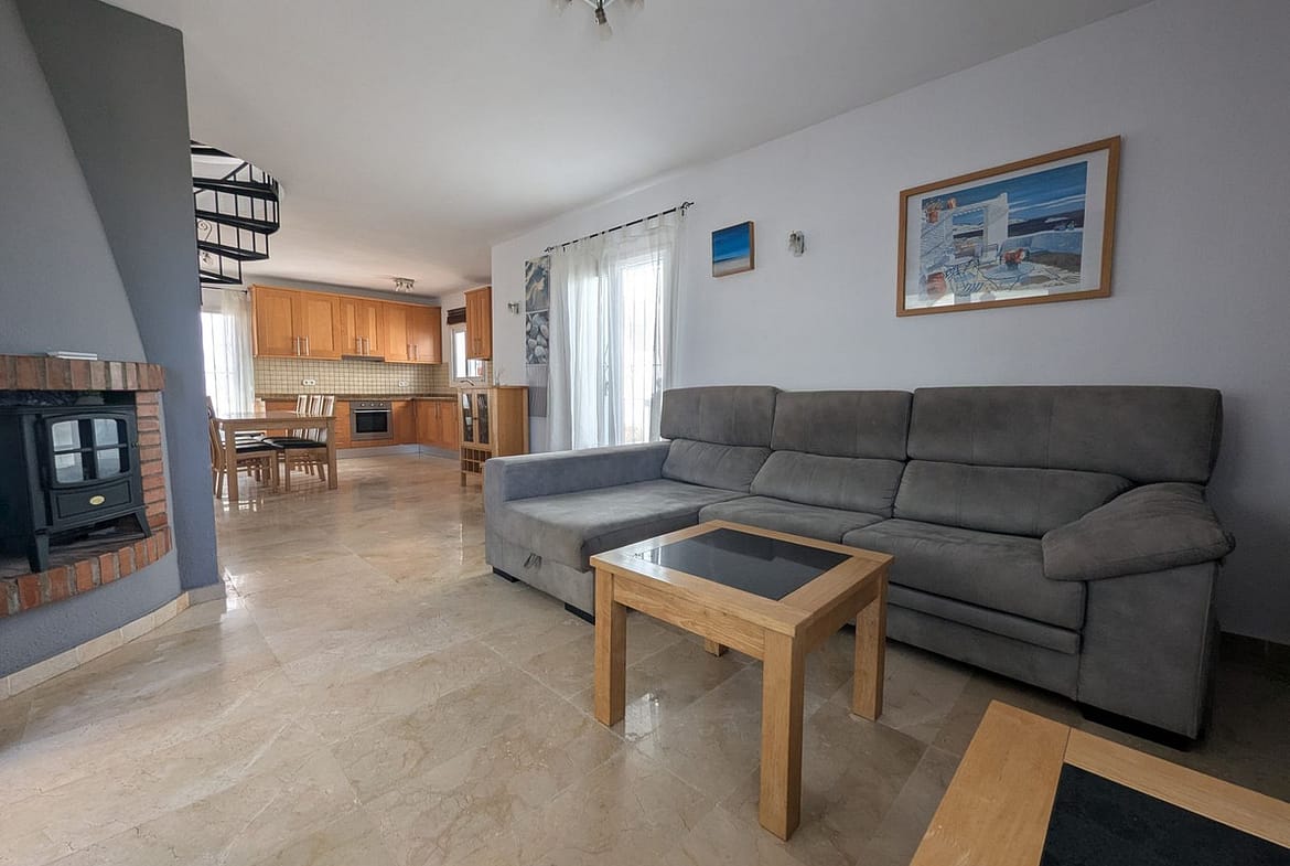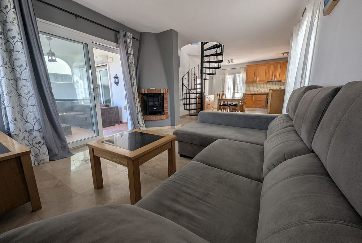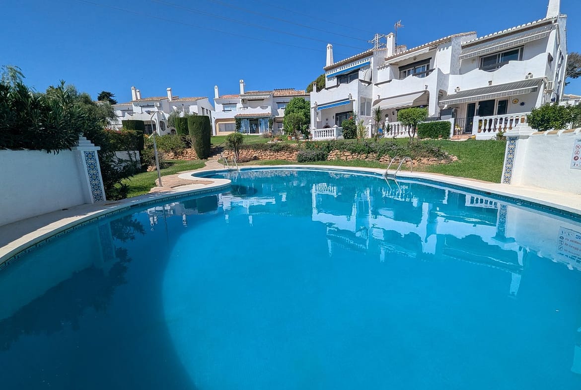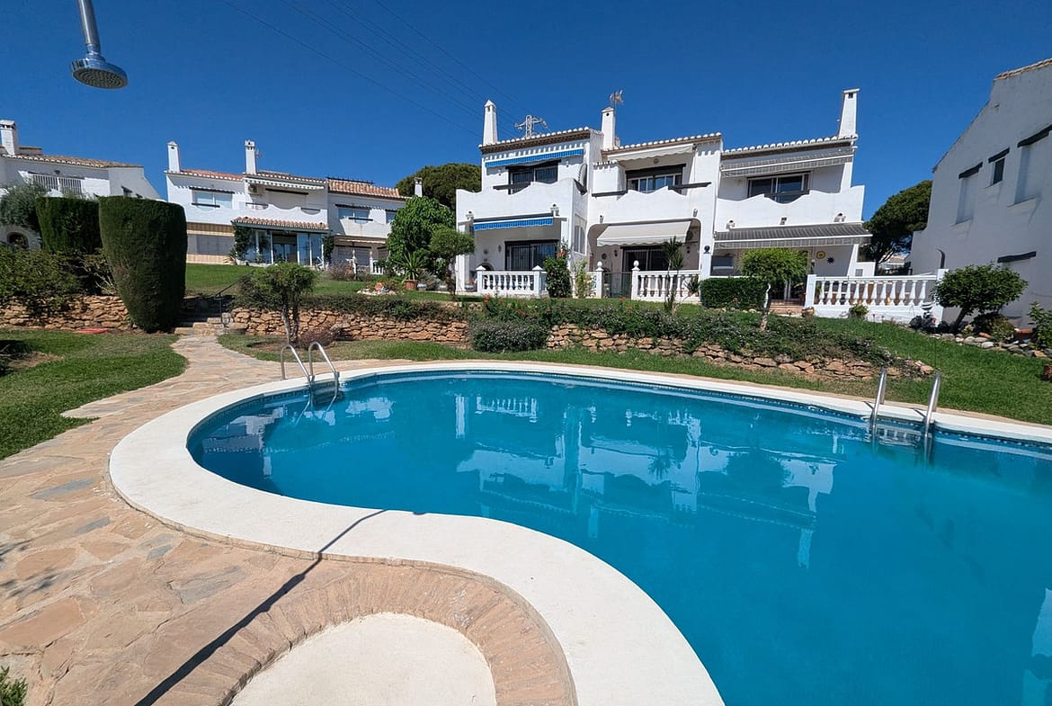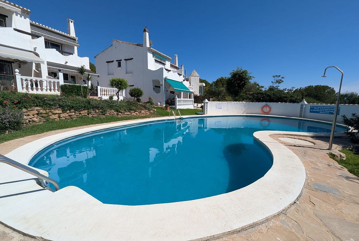 The home is distributed over two levels and offers three spacious bedrooms and two bathrooms. Two of the upstairs bedrooms open onto a private terrace with lovely views over the communal gardens, swimming pool, and even a glimpse of the Mediterranean Sea.