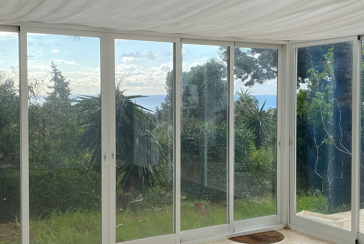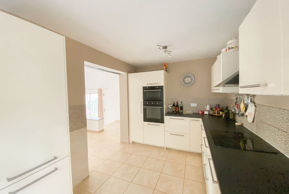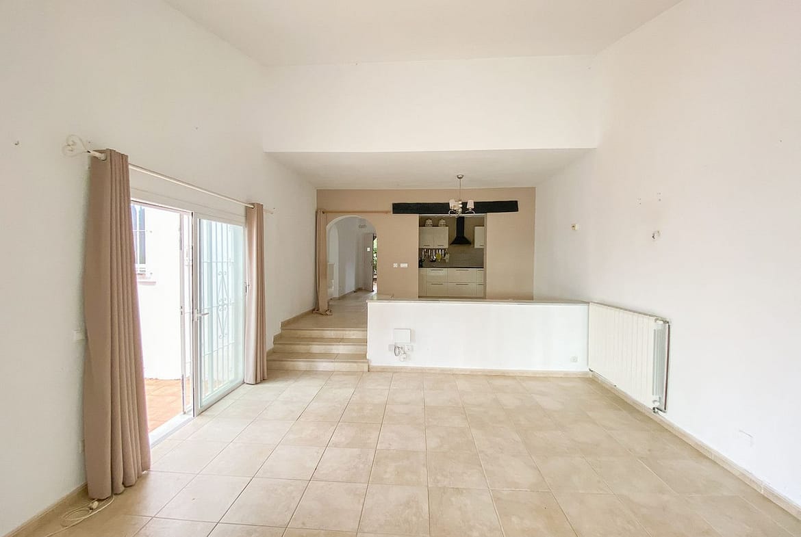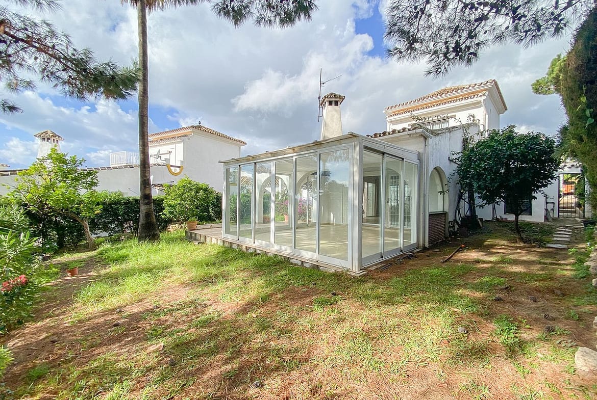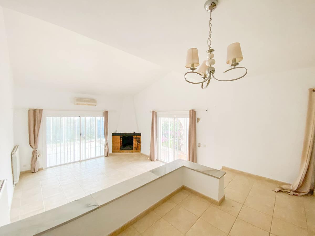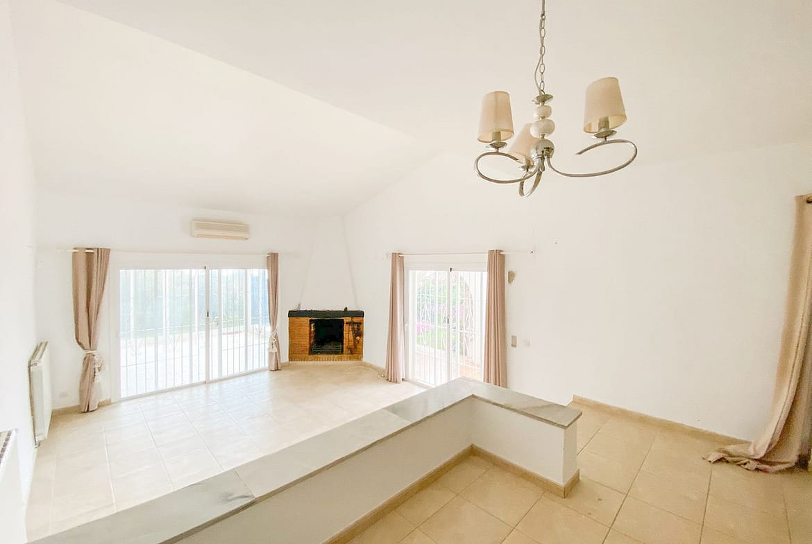 The property features a classic design with a spacious living room distributed on two levels and a separate kitchen. It currently has three bedrooms, all with en-suite bathrooms, and enough space to add a fourth bedroom after a renovation. Spacious terraces and a winter garden bring natural light and versatility to the living space, while the living room, with its cozy fireplace, is perfect for cooler evenings. The master bedroom is located upstairs and has a spacious bathroom and a private terrace. The entire house is equipped with air conditioning for added comfort.