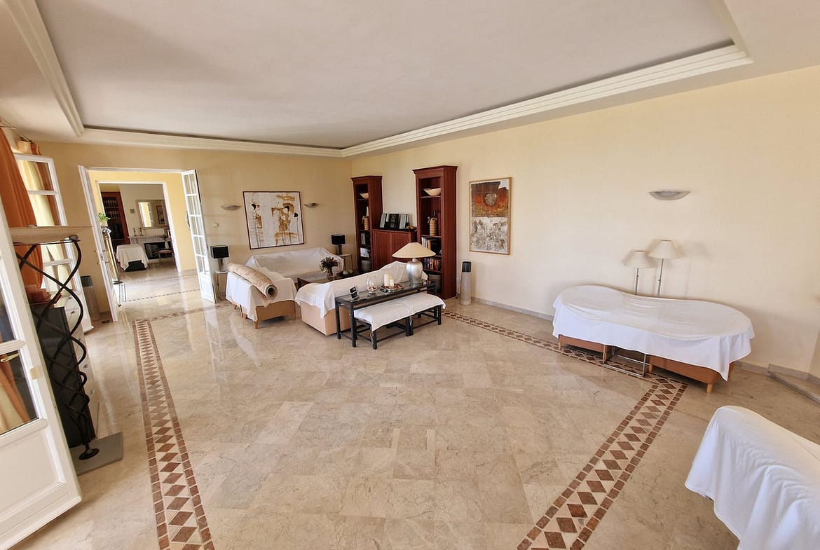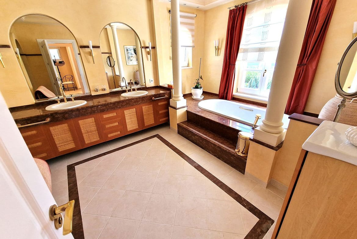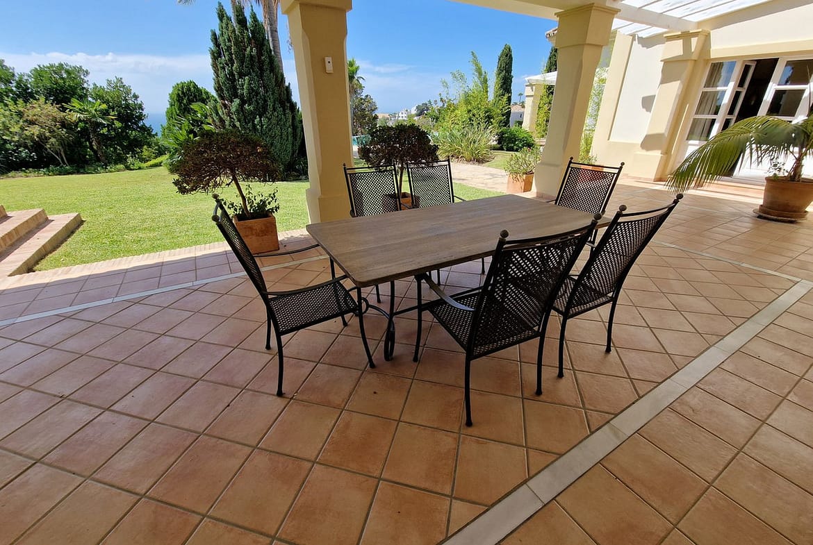 This villa is in a prime location in Calahonda, Mijas Costa, just 20 minutes from Marbella city center and just 30 minutes from Málaga city and the airport. Only 5minutes from the beach. Directly adjacent to a green zone, you can enjoy the unobstructed view of the sea and the African coast. The villa, built in a modern Andalusian style, is located on a plot with a total of 4,162m2 and has a built area of 771m2. The well-kept Mediterranean garden with old cork oaks and a small pine grove as well as a spacious private pool offers varied opportunities for leisure activities on different levels. A special property in a perfect and very private location!