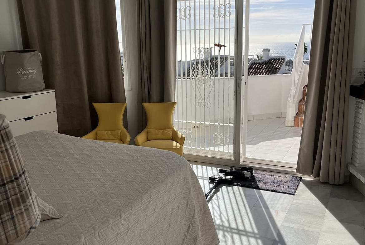 The first floor features two bedrooms and two bathrooms. The master bedroom stands out for its sea views and direct access to the solarium terrace, from where you can enjoy an impressive panoramic view of the coast and surrounding areas—a perfect spot for morning coffee or relaxing at sunset.