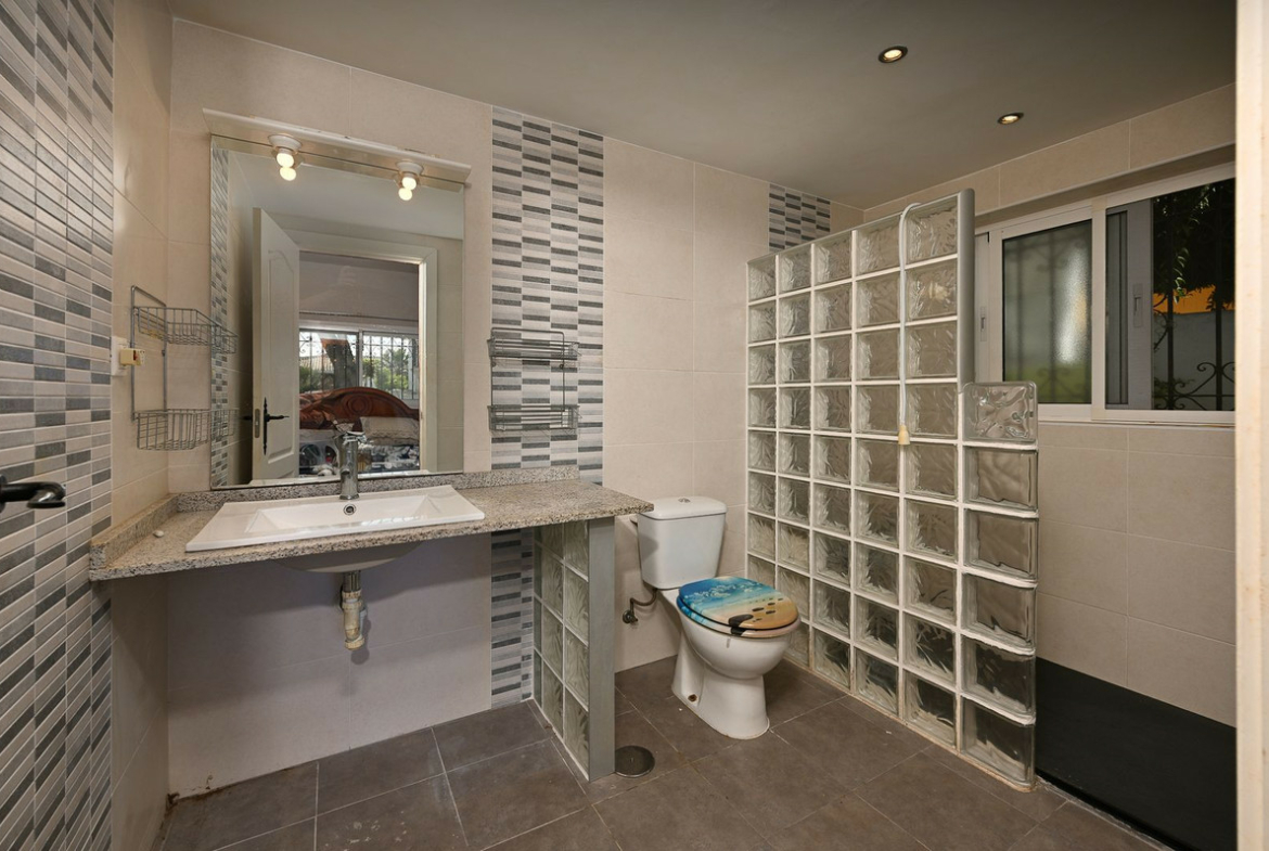 The villa offers a bright and open living area, a separate kitchen, and three well-sized bedrooms, each with its own en-suite bathroom, giving the property a great sense of privacy and convenience. Although the villa is in need of renovation, its spacious layout and prime location provide immense potential for modernisation and value growth.