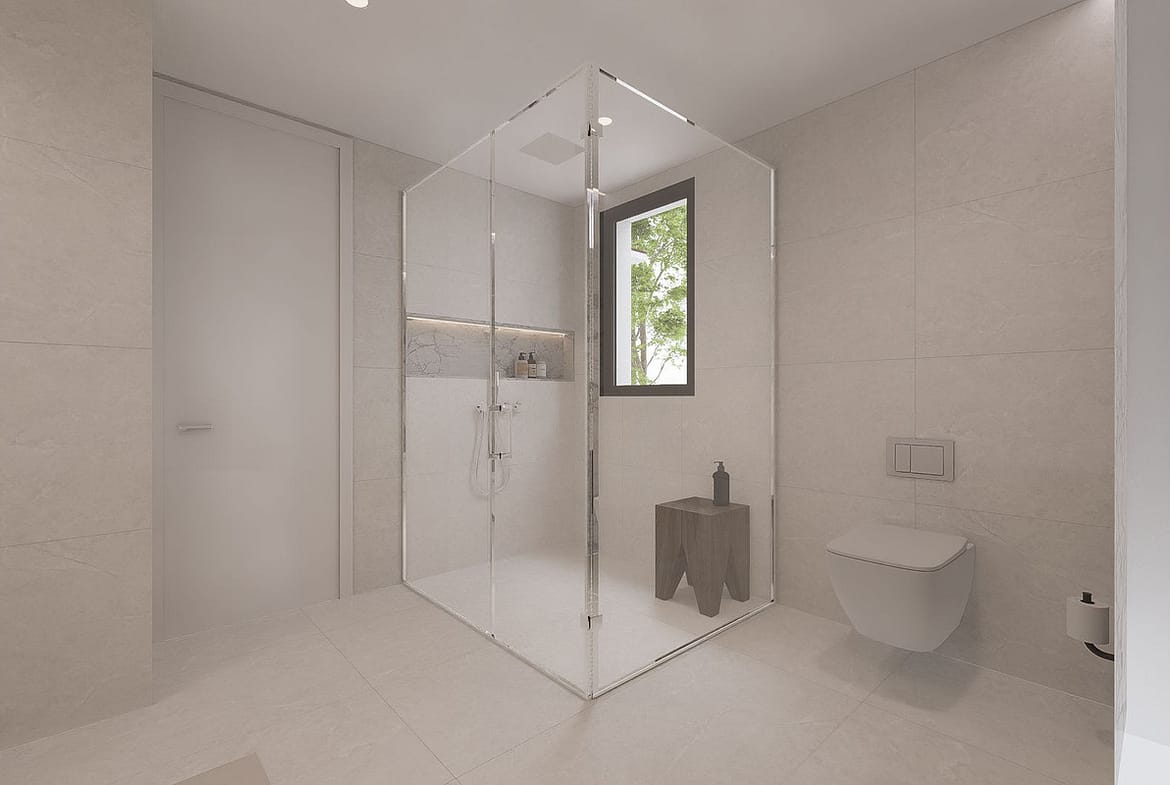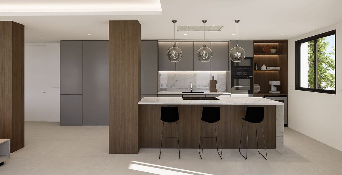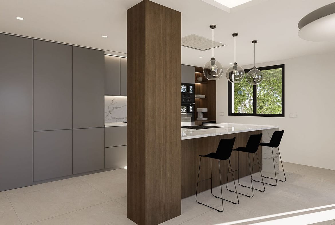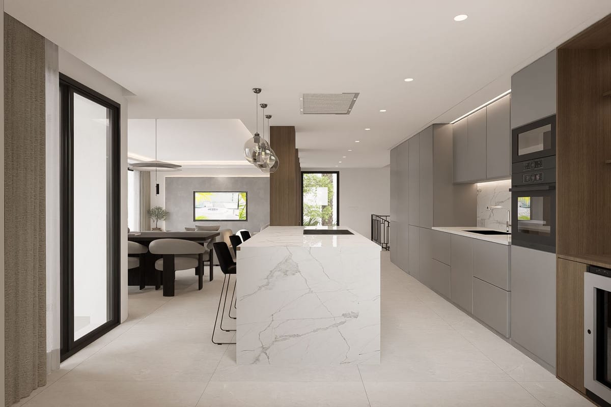 Filled with natural light, the villa boasts open-plan living areas with large windows and glass doors, seamlessly connecting indoor and outdoor spaces and enjoys open views with pleasant sea views. The modern open-plan kitchen features a large central island with an integrated cooking field, ideal for both everyday living and entertaining guests.