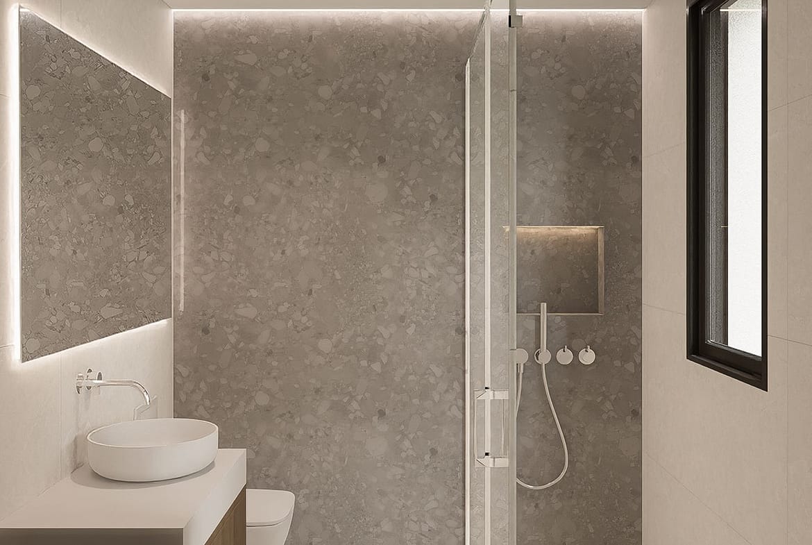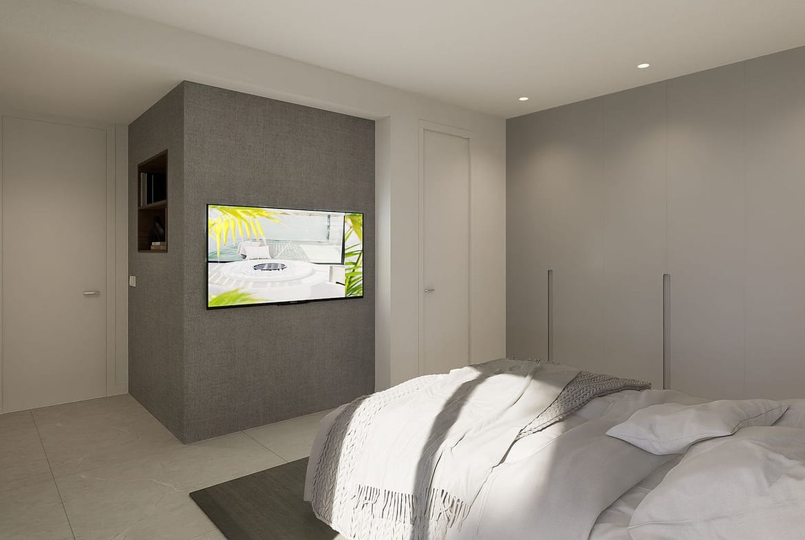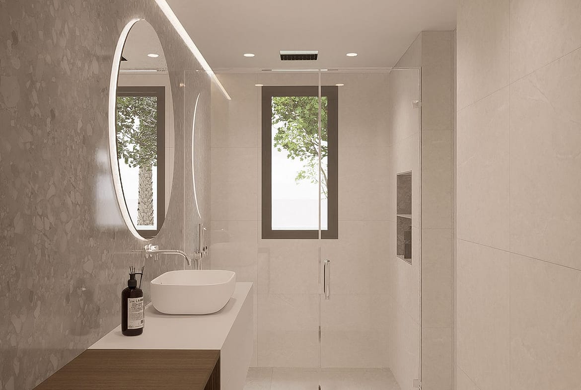 Filled with natural light, the villa boasts open-plan living areas with large windows and glass doors, seamlessly connecting indoor and outdoor spaces and enjoys open views with pleasant sea views. The modern open-plan kitchen features a large central island with an integrated cooking field, ideal for both everyday living and entertaining guests.