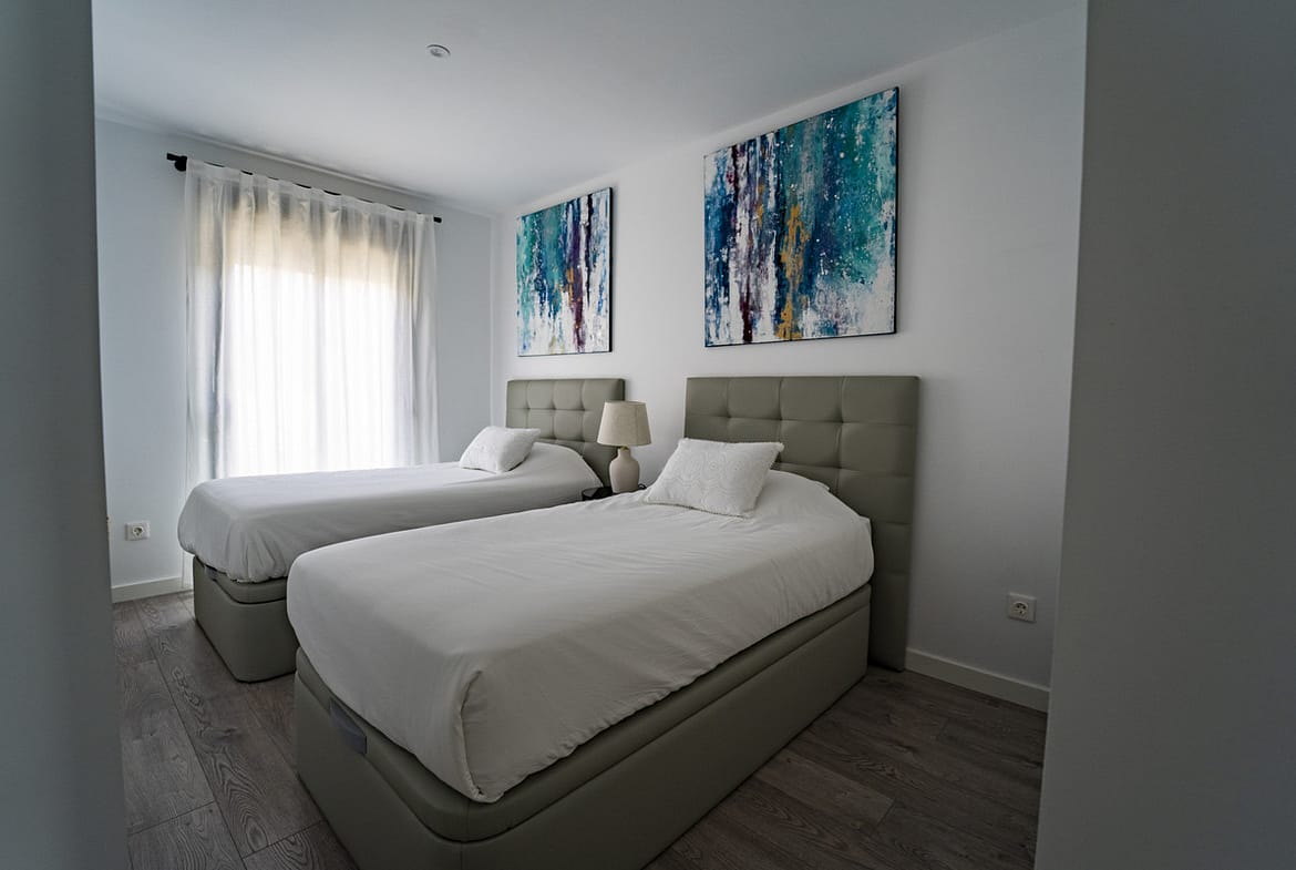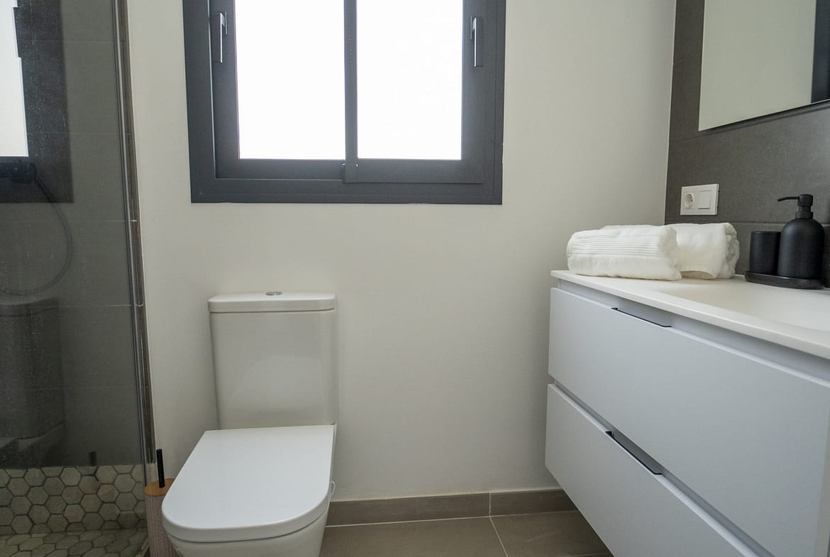 On the first floor, two well-appointed bedrooms provide cozy sleeping arrangements—one with a double bed and the other with two single beds. The top floor is reserved for the master suite, complete with a private bathroom and an exclusive terrace, offering the perfect spot to enjoy quiet moments in the sun.