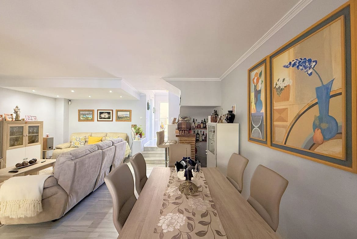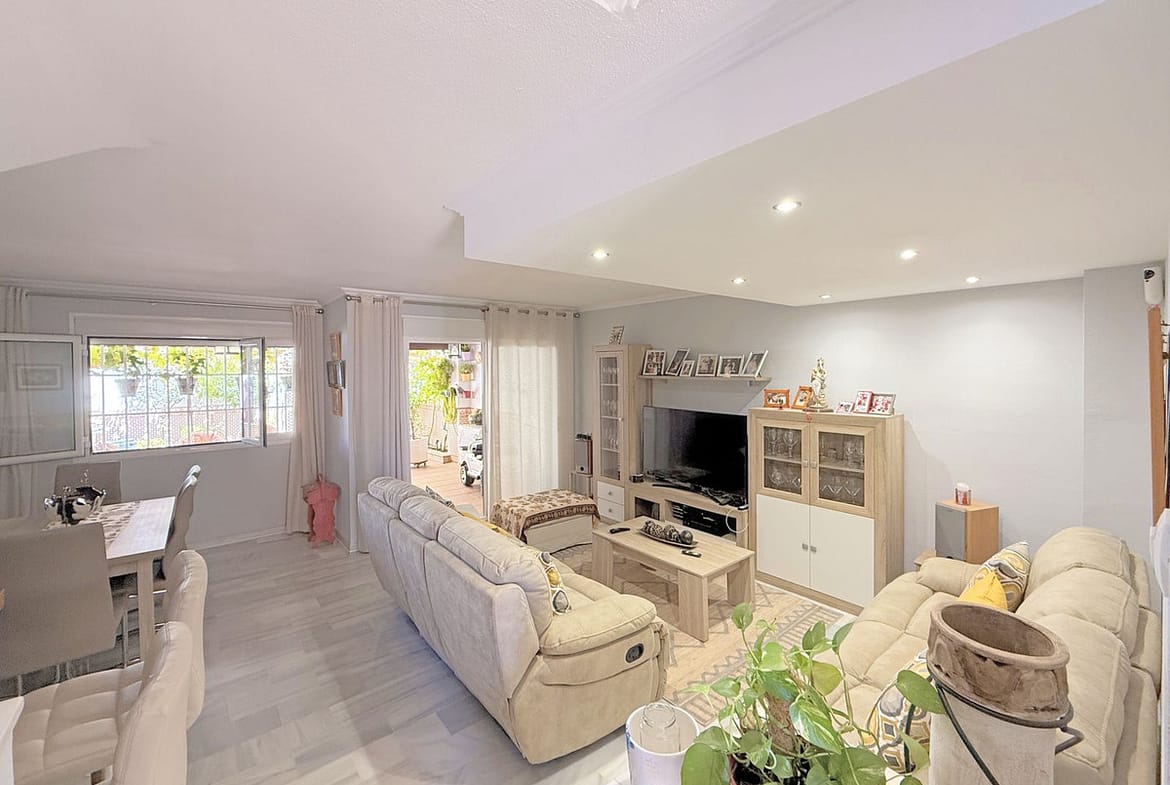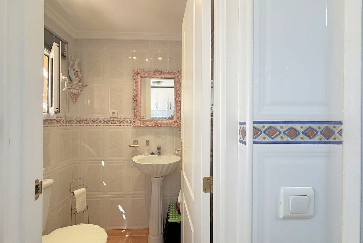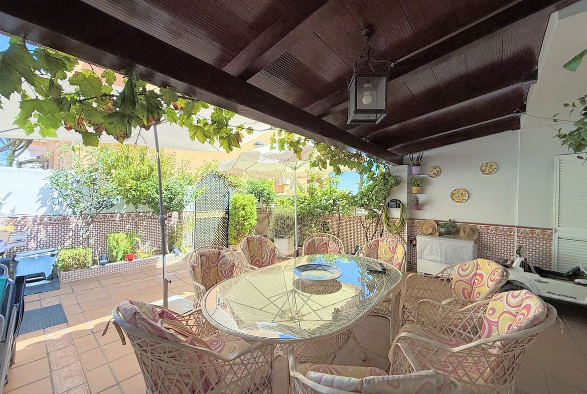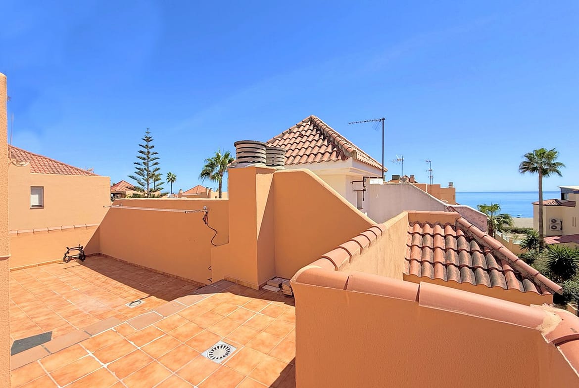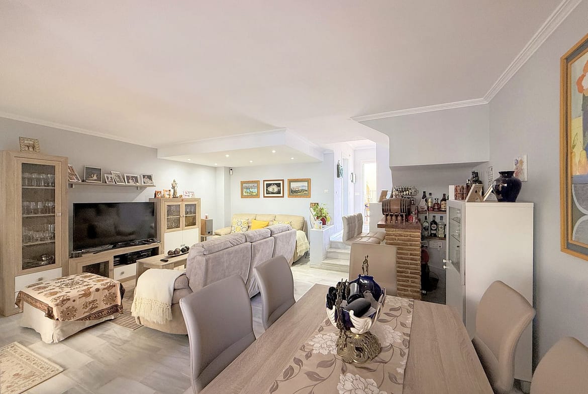 The property is distributed over two floors plus a spacious rooftop solarium with stunning sea views. It offers 3 bright and spacious bedrooms, a cozy living room, and a delightful Andalusian-style patio with fruit trees and direct access to the communal swimming pool and beautifully maintained gardens.
