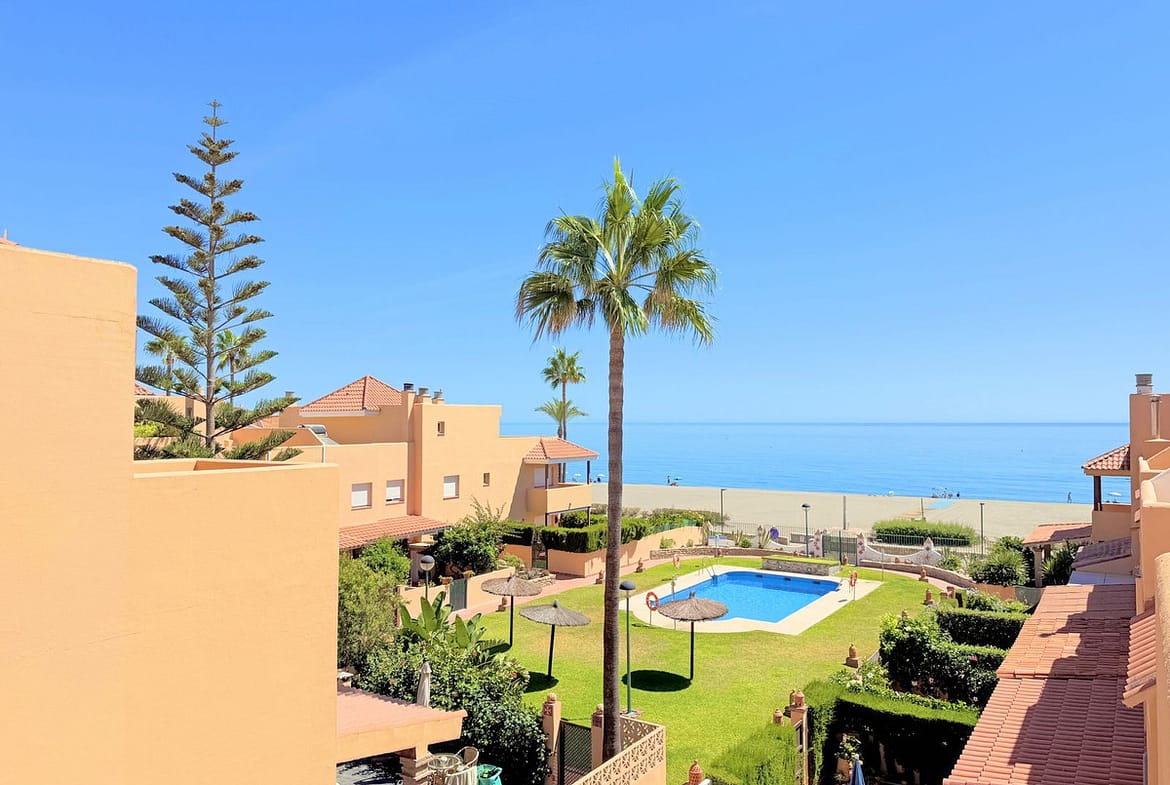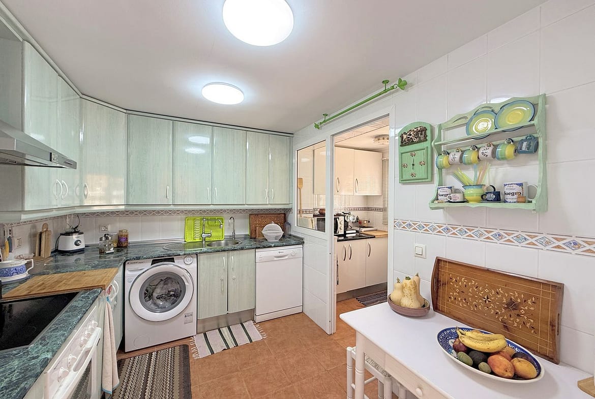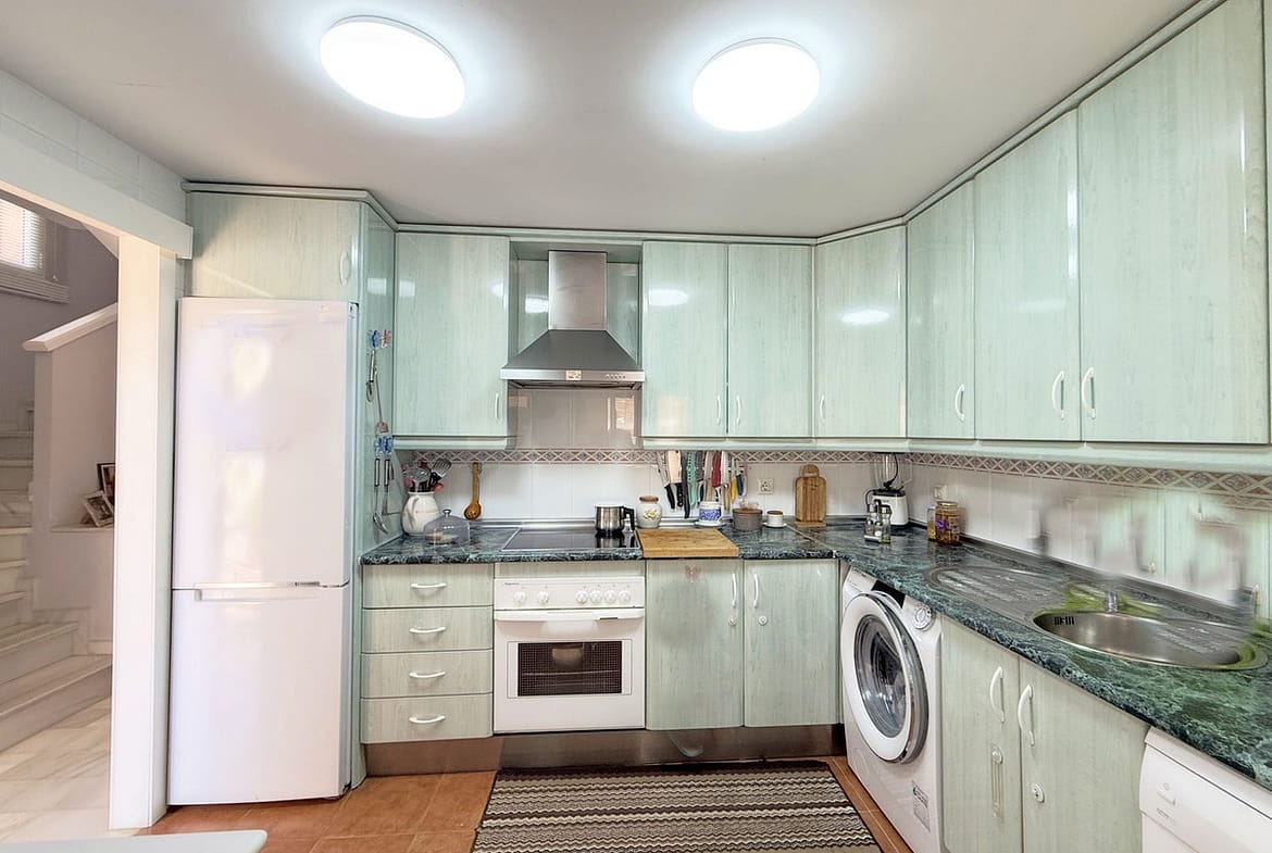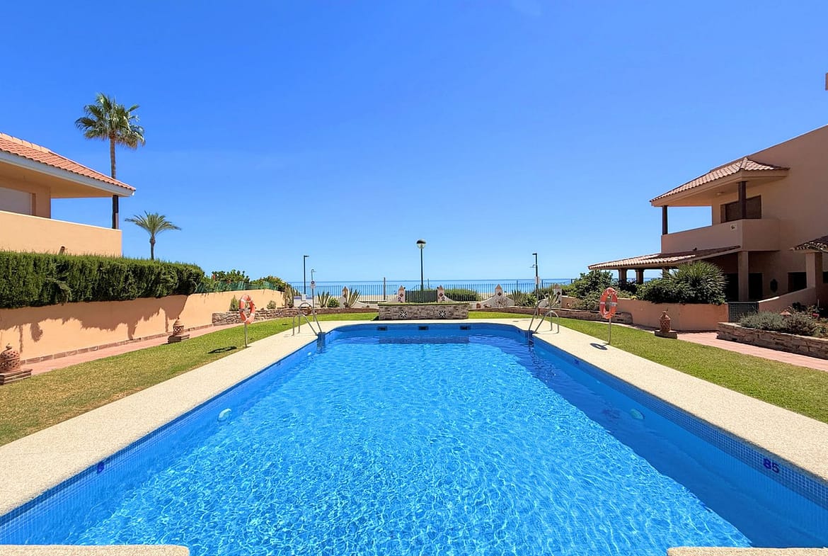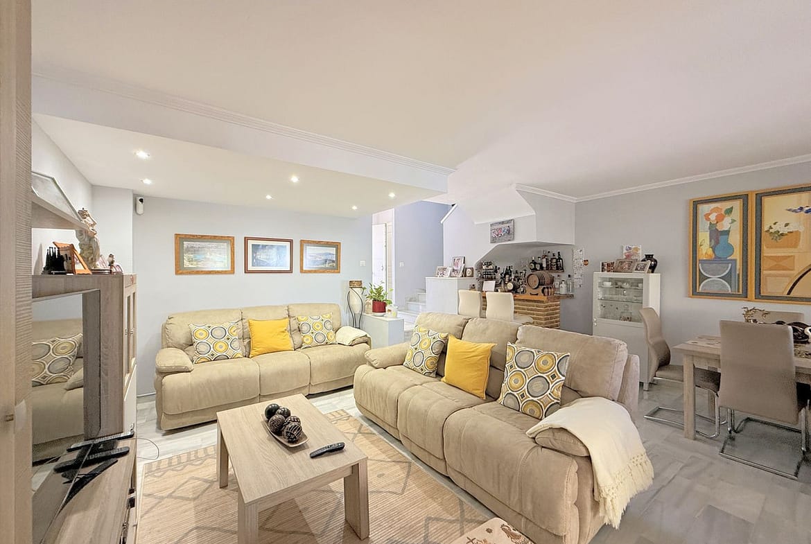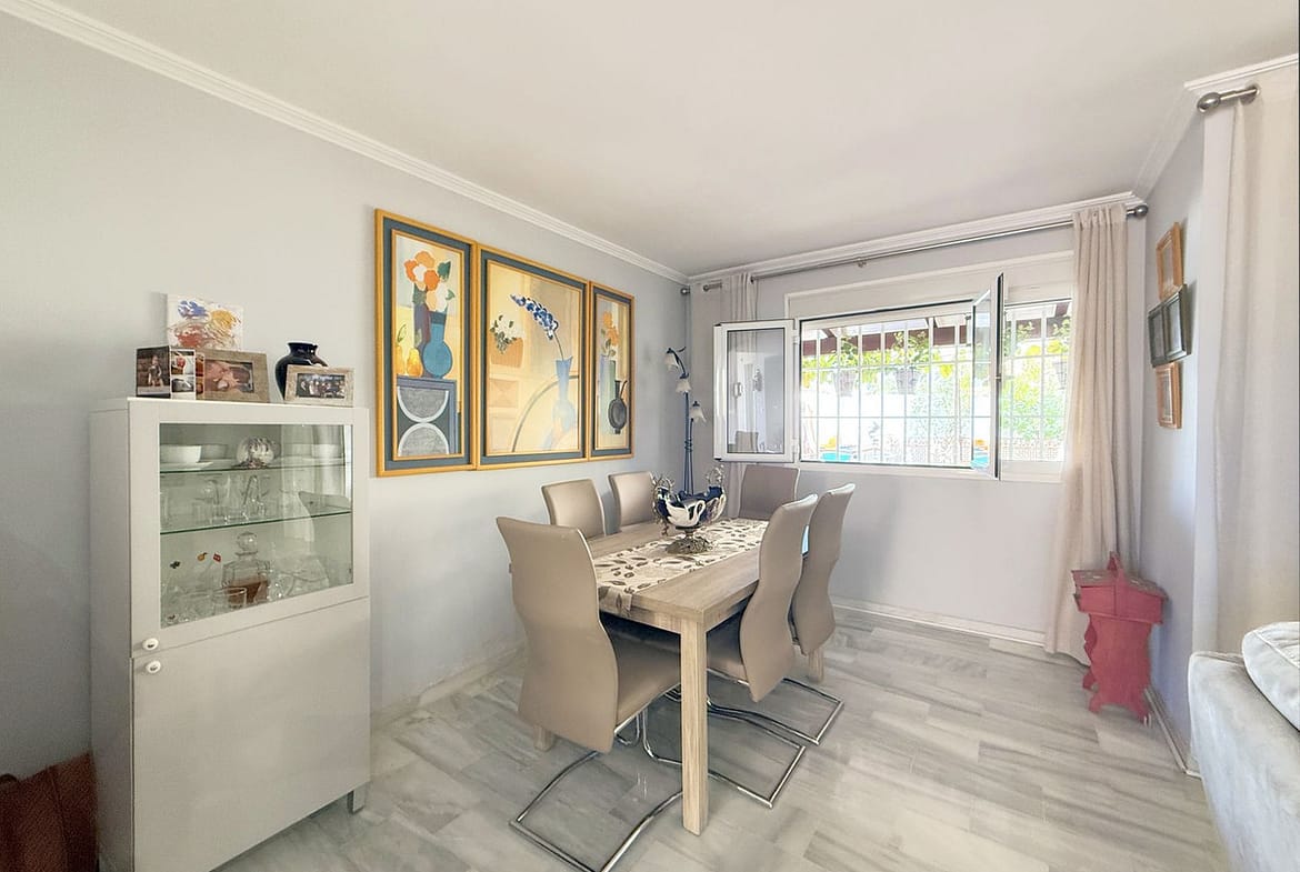 The property is distributed over two floors plus a spacious rooftop solarium with stunning sea views. It offers 3 bright and spacious bedrooms, a cozy living room, and a delightful Andalusian-style patio with fruit trees and direct access to the communal swimming pool and beautifully maintained gardens.
