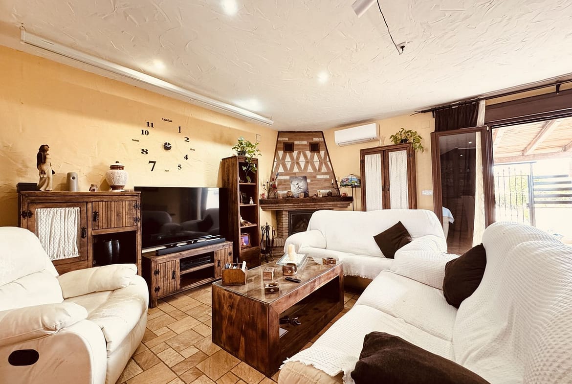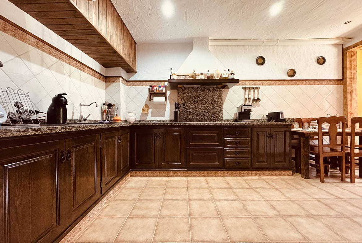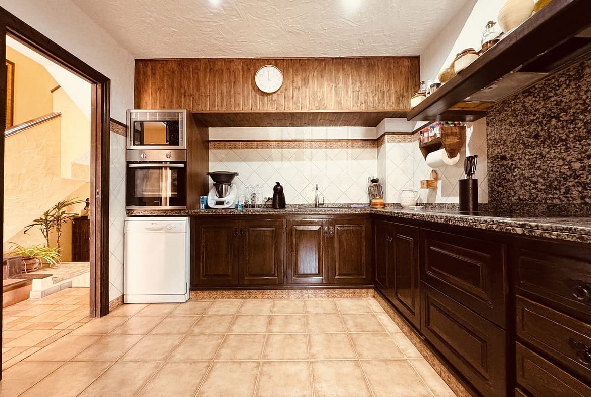 Inside, the home is filled with authentic Spanish charm. The ground floor features a spacious, fully fitted independent kitchen, and a generous open-plan living and dining area complete with a cozy fireplace. From here, step out onto the southeast-facing covered terrace, which enjoys direct access to the beautifully maintained communal gardens and swimming pool—perfect for relaxing or entertaining.