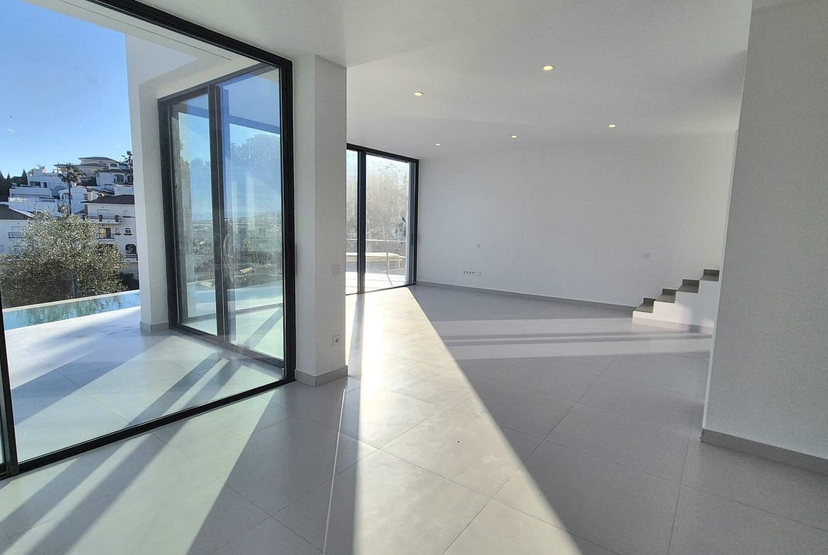 This immaculate 3-bedroom villa with 3 ensuite bathrooms has recently been totally renovated to a high standard. It is set in an elevated position in Cerros de Aguila with unparalled panoramic sea and mountain views. You enter via a long driveway with private parking plus a covered garage for 2 cars and with a good-sized storeroom. There is a gated entrance to the one level villa with an open plan living/dining room and kitchen diner both with access to large terraces with panoramic sea views and to the landscaped gardens with an infinity pool. There are 2 guest bedrooms with ensuites with access to the back garden and terraces, a guest toilet, and a large master bedroom with a feature bath, washbasin and toilet with panoramic views to the sea. The property has underfloor heating throughout with electric blinds and hot and cold air conditioning. The property is all fenced and alarmed with terraced gardens with a selection of fruit and palm trees. There is also a roof solarium with panoramic 360-degree views of the mountains and the sea. The property is within easy access to Fuengirola and Mijas, bars, restaurants, beach and the new Mijas park. You also have the well-placed community pool, gardens, sport facilities, bars and shops of the local community of Cerros de Aguila.