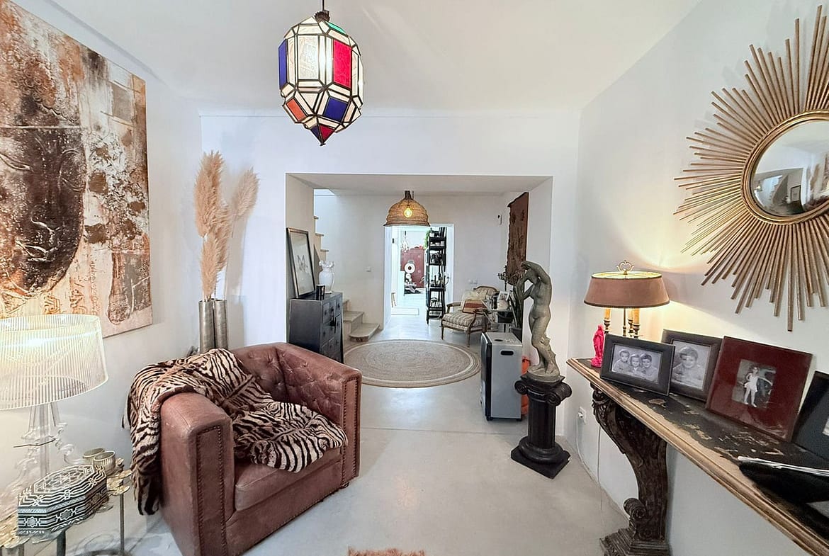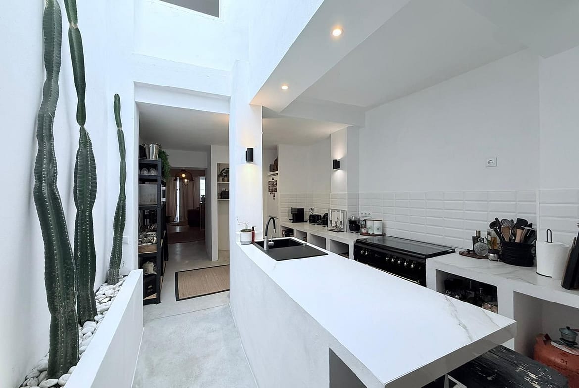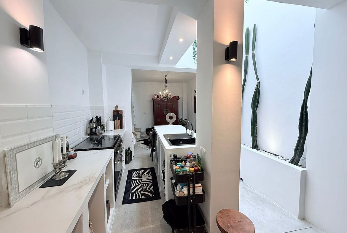 Arranged over three light-filled floors, the home features a spacious open-plan lounge and dining area, flowing seamlessly into a striking fully equipped open-plan kitchen with a range-style oven and central island. A dramatic bespoke light feature runs through the centre of the house, flooding the interiors with natural light and enhancing the airy, elegant, riad-like feel. Beyond the kitchen is an additional lounge area, ideal for entertaining or quiet relaxation. Two separate staircases add both character and flexibility to the layout.