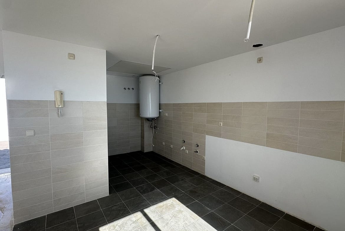 Access is through a pleasant porch, ideal as a welcoming area or outdoor relaxation space. Inside, there is a spacious living-dining room perfectly connected to the kitchen, creating a practical and comfortable atmosphere for everyday living. This floor also includes a bathroom and an independent laundry room.
