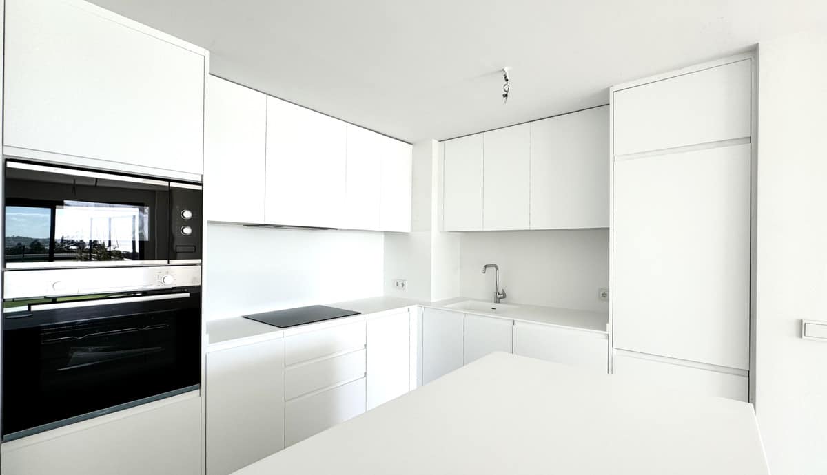 This beautiful house has a light-filled living room and dining room. The kitchen is fully equipped with BOSH household appliances and has an island where you can prepare meals while admiring the wonderful views thanks to large windows reaching the ceiling.