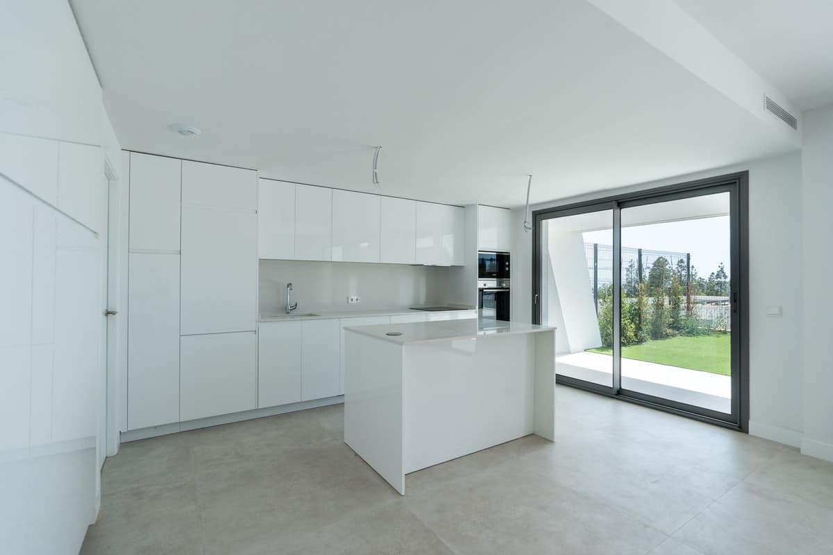 The main level features a very spacious open plan kitchen/living/dining area measuring 48 m2. The fully fitted modern kitchen includes Bosch appliances and an island with breakfast bar. The independent utility room is equipped with Bosch washing machine and separate Bosch tumble dryer. A guest WC is also conveniently located on this floor. The ceiling to floor windows bring natural light into the living area, which enjoys the full width of the property, and connects seamlessly with the large terrace and private garden providing an outdoor area measuring 67 m2, ideal for entertaining.