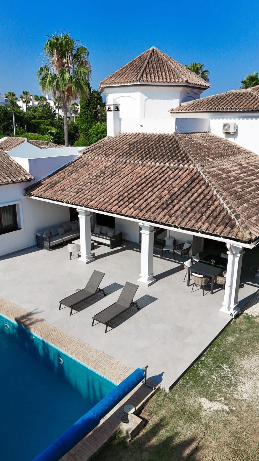 Situated in the prestigious and tranquil area of El Paraíso, Estepona, this stunning villa offers the perfect blend of space, comfort, and classic charm. Set on a generous 973 m² plot with over 400 m² built, this beautifully designed home spans two floors plus a basement, offering a functional layout ideal for family living or as a holiday retreat.