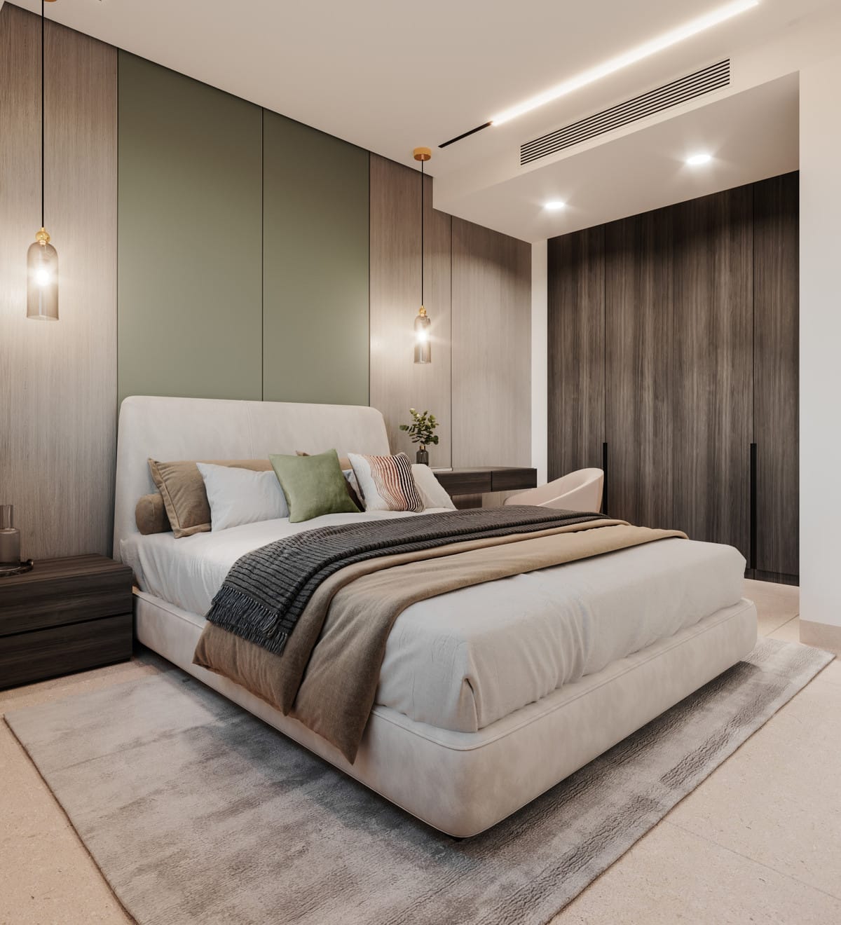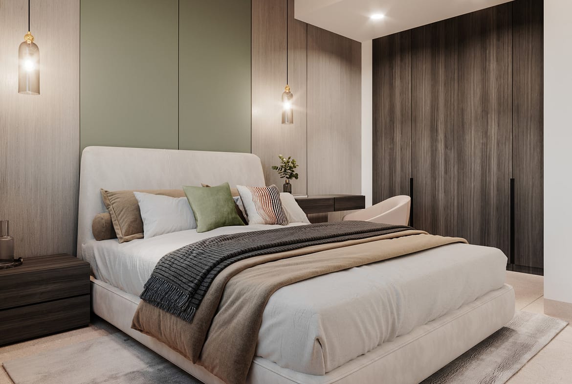 The interiors are designed with comfort and functionality in mind. Bedrooms use soft materials and warm tones, with a master suite that includes an en-suite bathroom, dressing room, and private terrace. Two additional bedrooms feature built-in wardrobes and share a full bathroom with neutral, modern finishes. Living areas include an open-plan kitchen fitted with Siemens appliances (with alternative ranges available), a guest toilet, and a generous living-dining space with large windows opening directly onto the terrace and garden.