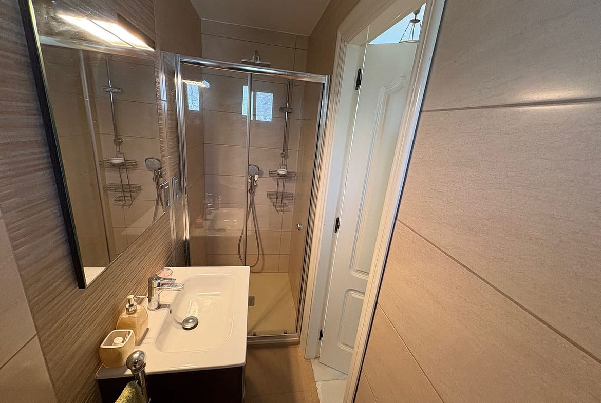On the lower floor, the property offers the master bedroom with en-suite bathroom and two guest bedrooms sharing a bathroom. From this level there is access to another terrace and a private garden area with a pleasant chill-out space and the possibility to create a barbecue area, ideal for relaxing and entertaining outdoors.