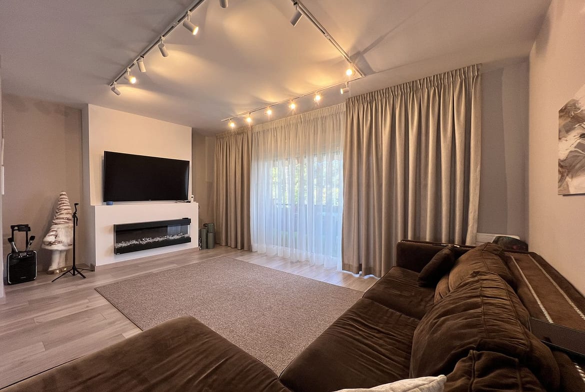 On the lower level, there is a large private garage plus a practical machinery area and storage room, adding functionality and extra storage space.