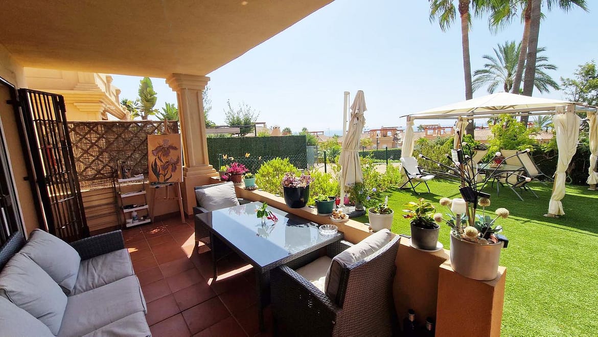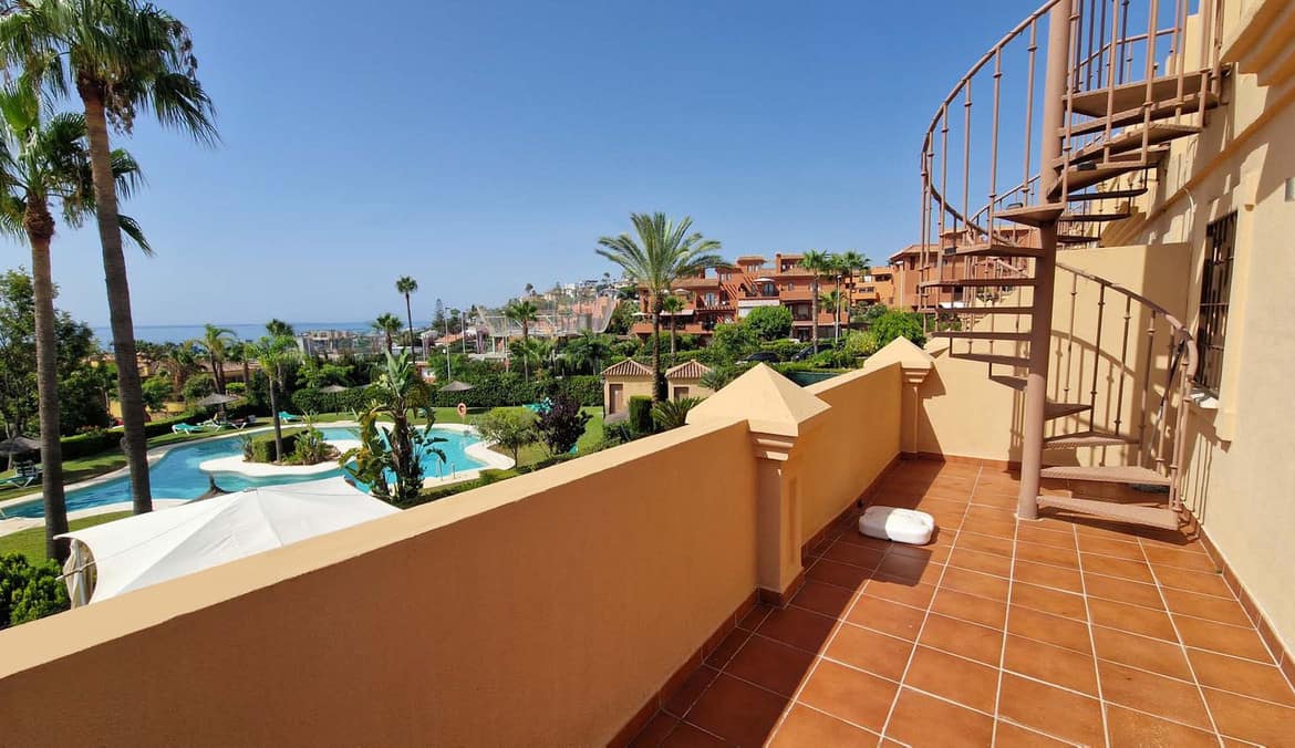VERY NICE SEMI-DETACHED HOUSE WITH SEA VIEWS FOR SALE IN ESTEPONA!! This corner townhouse is located in the sought-after, secure, private development of Galera Park. Located 200 meters from the seafront, its location within the development protects it from the noise of the coastal road. The house is built on four floors. All floors have an elevator. The first level is the private underground garage, where two vehicles can easily be parked. The owner replaced the garage door with a much better-quality automatic one when he bought the property. The second floor consists of a beautiful living/dining room, a fully equipped semi-open kitchen, and a guest toilet. The living room leads out onto a charming terrace with a bit of sea view and a large, pleasant private green area overlooking the pool and the sea. On the first floor, there are three bedrooms and two bathrooms. The master bedroom has an en-suite bathroom and leads out onto a terrace that provides access to the fourth floor, the solarium, from where you can observe the surroundings and enjoy splendid sea views. You can see the sea from the living room terrace and also from the master bedroom terrace. The house has always been very well maintained by its owners, who even soundproofed the side wall of their only neighbor. Many shops are nearby, including two large supermarkets! This property is being sold partially furnished. All appliances remain. Ideal property for a family, either as a primary residence or for vacations.