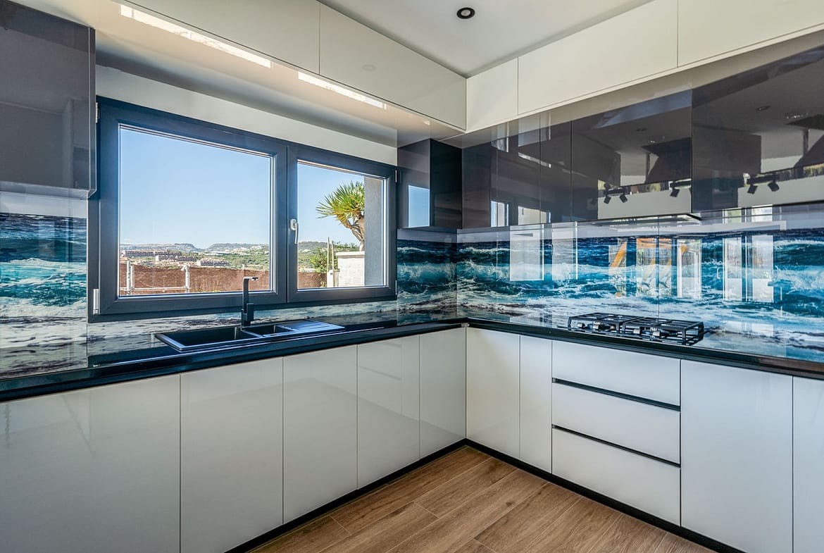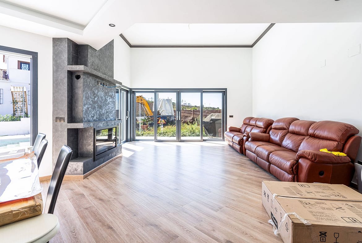 Upon entering the villa, you step into a bright and inviting living room. The abundant natural light floods the space through large glass doors that open up to the inviting swimming pool area. A charming fireplace graces the room, providing warmth and coziness for chilly evenings. The open-plan kitchen seamlessly connects to the living room, making it ideal for hosting gatherings and entertaining guests. The living area is spacious enough to accommodate a dining area, perfect for enjoying meals with family and friends.