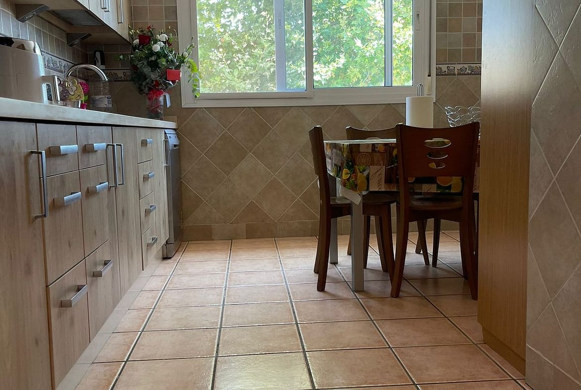 You can access the property either through the large private garage on the ground floor or by steps leading up to the main entrance. Upon entering, you’re welcomed into a spacious front room with a cozy chimney and direct access to a small terrace with a built-in BBQ—ideal for relaxing or entertaining. Just off the living space is a bright, modern kitchen that overlooks a peaceful green park.