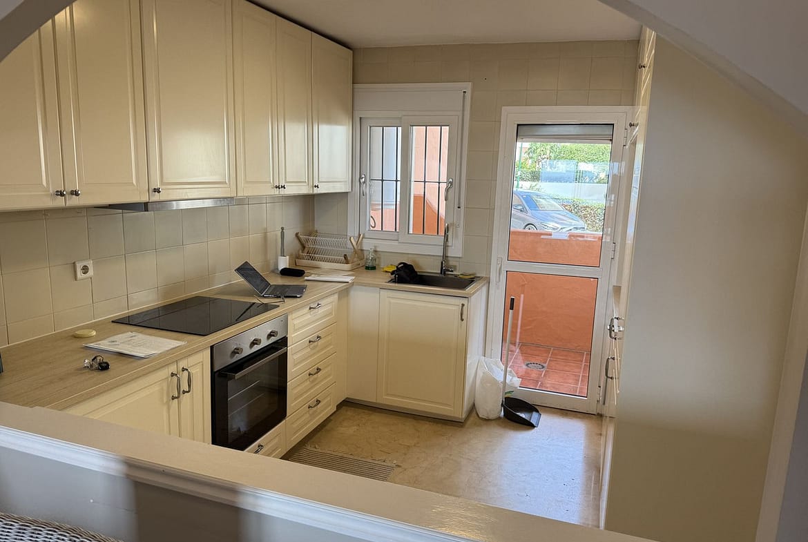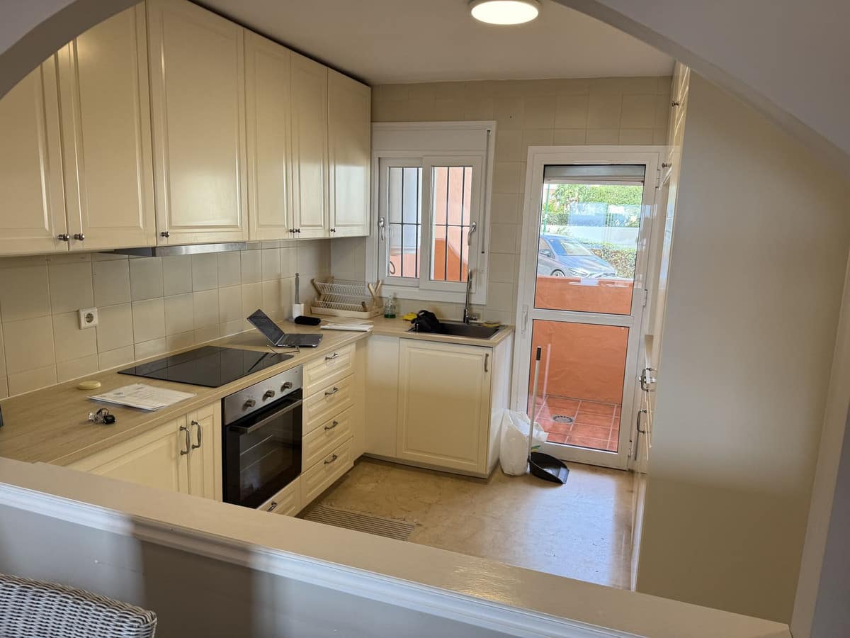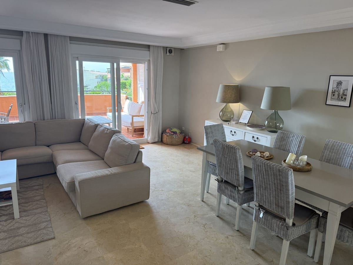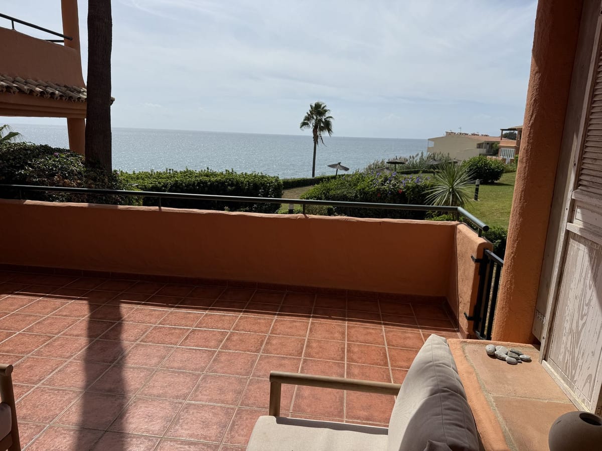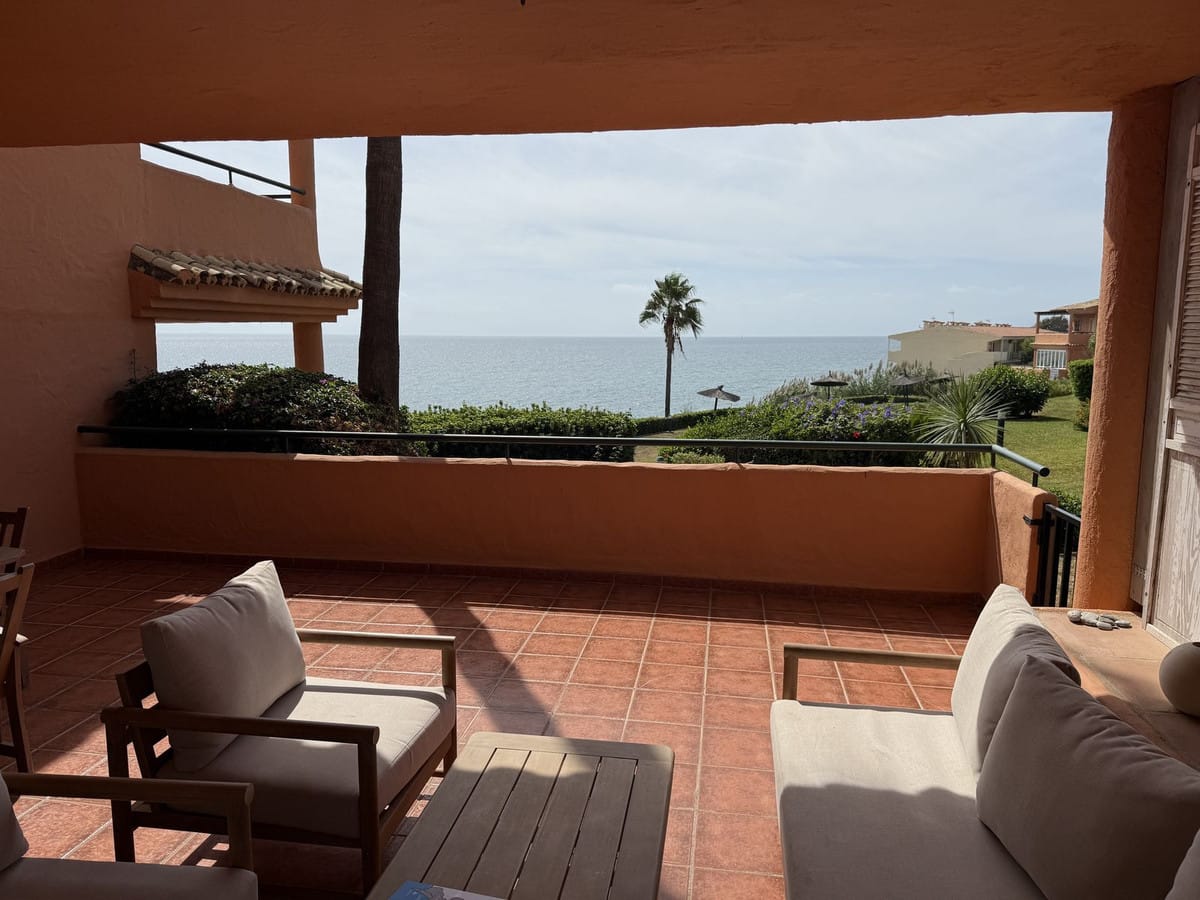 This is a fantastic property situated in Bermuda Beach, in an enviable front line beach position offering panoramic sea views. The property is currently being renovated to a very high standard including a new Italian kitchen, bathrooms in a modern contemporary style and new windows. The resulting effect is stunning and makes a perfect luxurious family home. The views can be appreciated from the moment you enter the property giving the “wow” factor. The kitchen and living room areas has been made into an semi Open-plan format making it much more spacious. There is ample space on the terrace which leads off from the living room – enough for sun-beds as well as a large dining table and chairs. Upstairs are the bedrooms with the Master bedroom having an ensuite bathroom and its own spacious balcony with those incredible sea views and two further guest bedrooms sharing a bathroom. There is a private space for the car and there is a supermarket and restaurants within easy walking distance and it is only 10 minutes by car to arrive at the town of Estepona. A great value for money property in an unbeatable location.