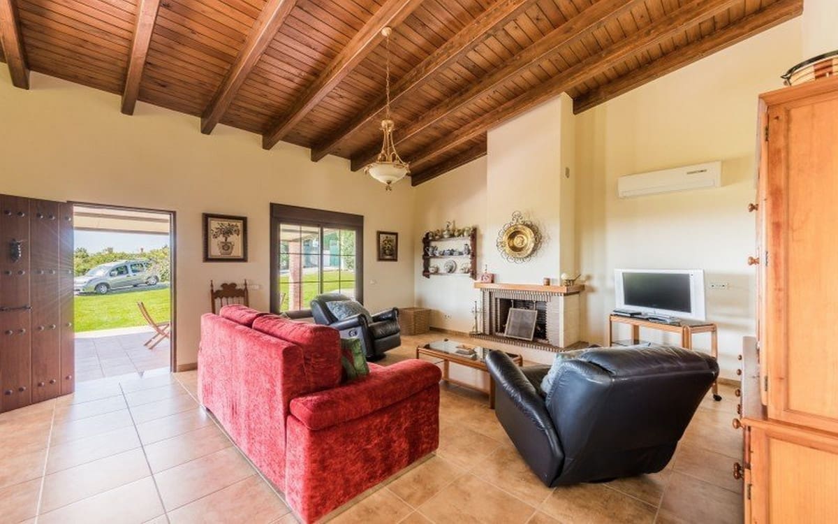 The villa is surrounded by a lush garden filled with fruit trees, providing a natural oasis right at your doorstep. Completely rebuilt using exquisite materials, the home features high, beamed ceilings that add a touch of rustic elegance. The spacious sitting room with a cozy fireplace flows seamlessly into a fully equipped kitchen, making it ideal for both relaxation and entertaining.