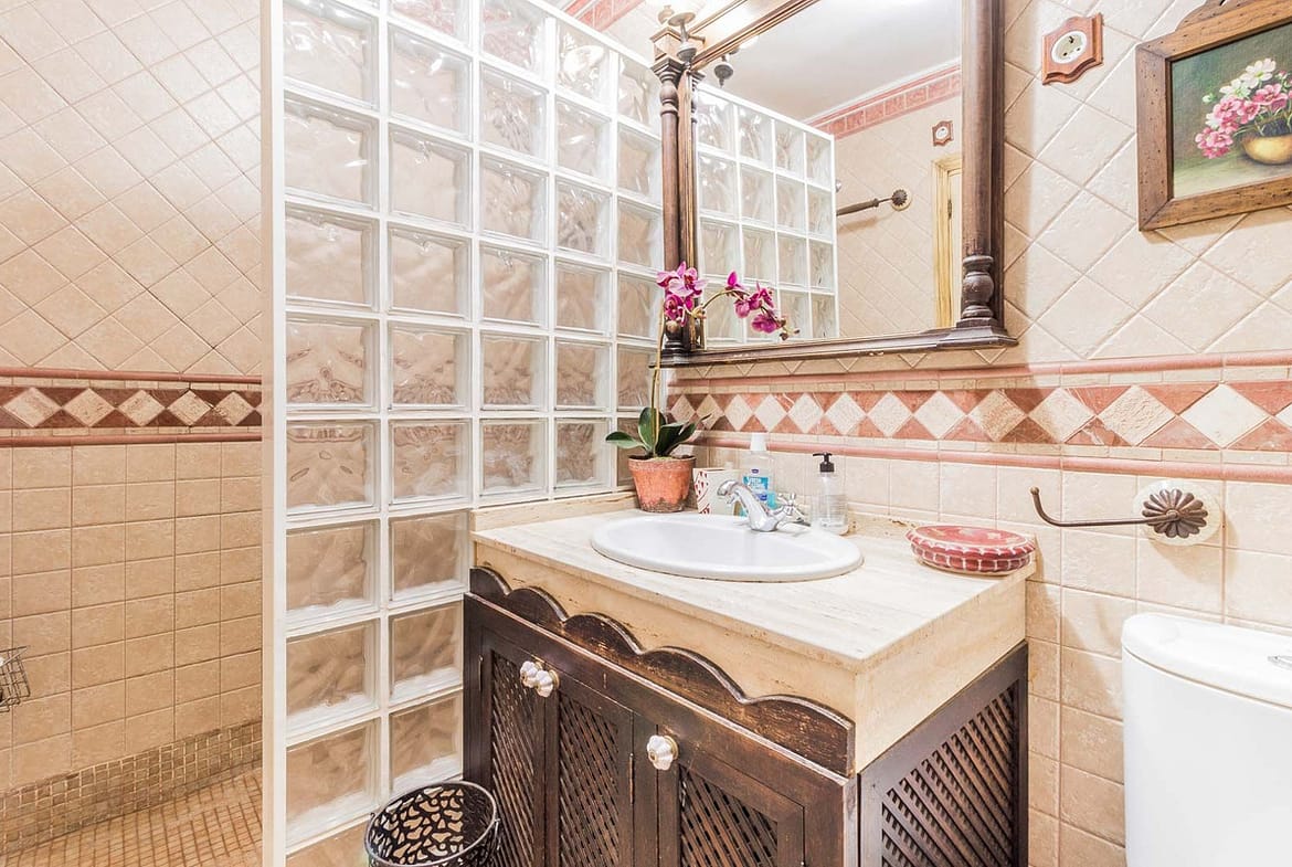 On the upper floor there are three bedrooms. The master bedroom has an en-suite bathroom, while the other two share a second full bathroom. Two of the bedrooms have direct access to a large terrace with balcony, from where you can enjoy stunning open views to the sea and the port of Estepona.
