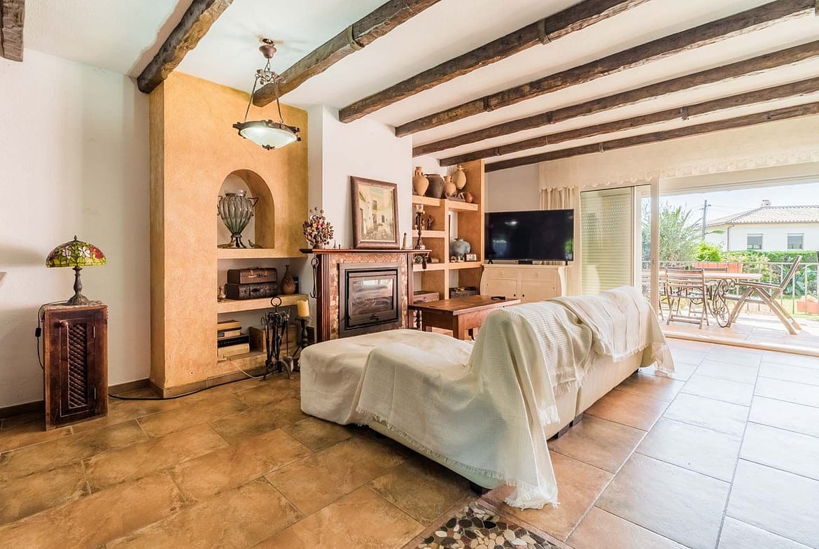 The house is distributed on two floors. On the first floor, we are greeted by an elegant entrance hall with guest toilet. The kitchen, fully equipped, is presented with a practical American bar open to the spacious living-dining room, which has a fireplace and a pleasant southeast orientation that ensures natural light throughout the day. From the living room there is access to a large terrace ideal for outdoor dining, as well as a charming private garden with direct access to the communal pool.