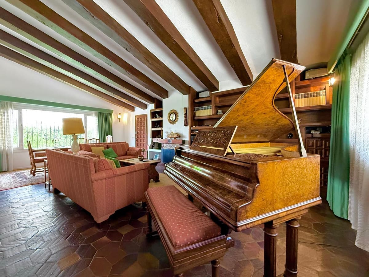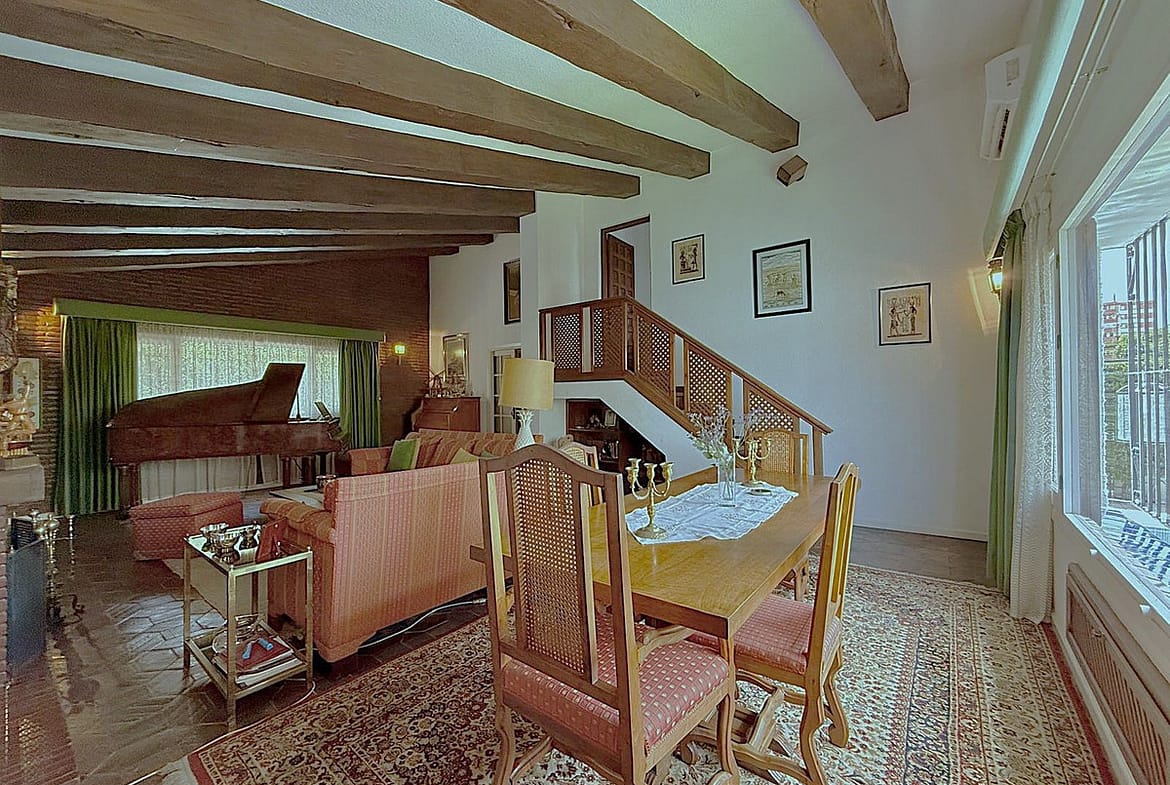 • A spacious living-dining room of over 60 m², featuring a high ceiling with decorative beams, a fireplace, and an elegant hardwood bookcase.