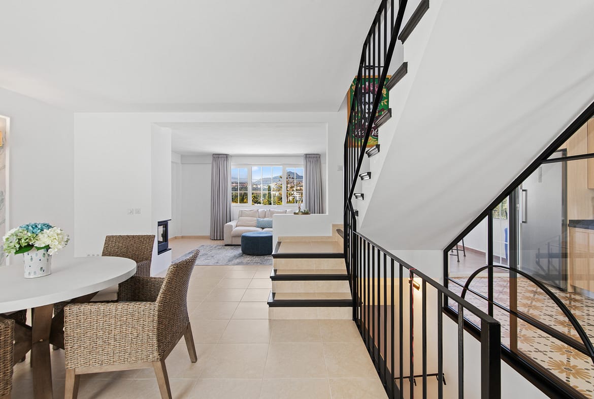 The property combines modern living with charming traditional touches to create a comfortable and welcoming home. A private courtyard patio greets you as you enter through the gate. On the ground floor, there is a spacious living and dining area filled with natural light, along with a fully modernised urban-chic kitchen. From here, you can step out onto a covered terrace with incredible views over the golf course — a lovely spot for outdoor dining or relaxing.