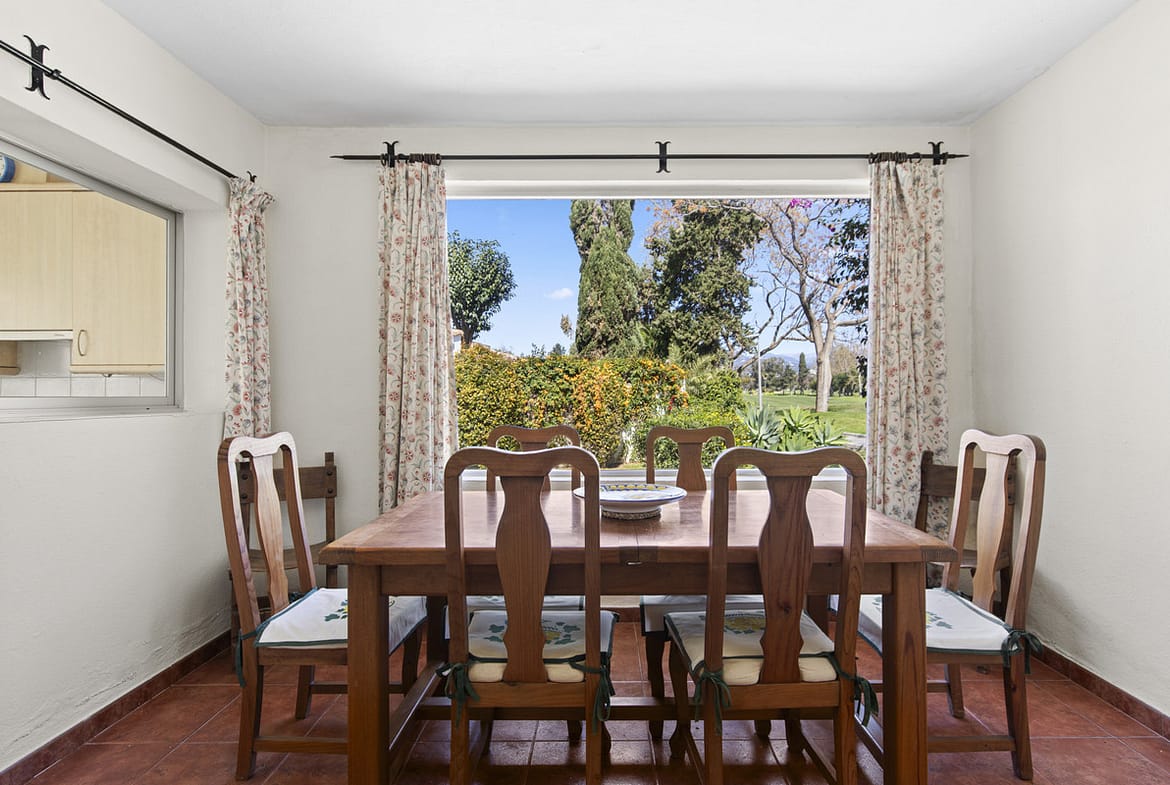 The property features three bedrooms and two bathrooms, with the dining room enjoying picture perfect views over the golf course through an impressive bay window. Two covered terraces create inviting outdoor living spaces, ideal for relaxing or entertaining in complete privacy. A private garage accommodates one car, while the surrounding lush, mature gardens further enhance the sense of seclusion and charm.