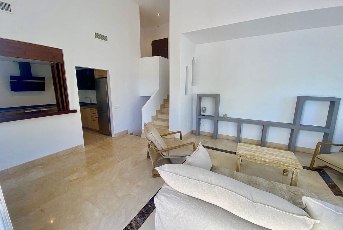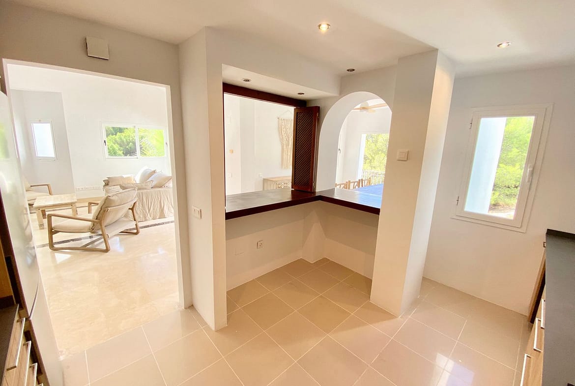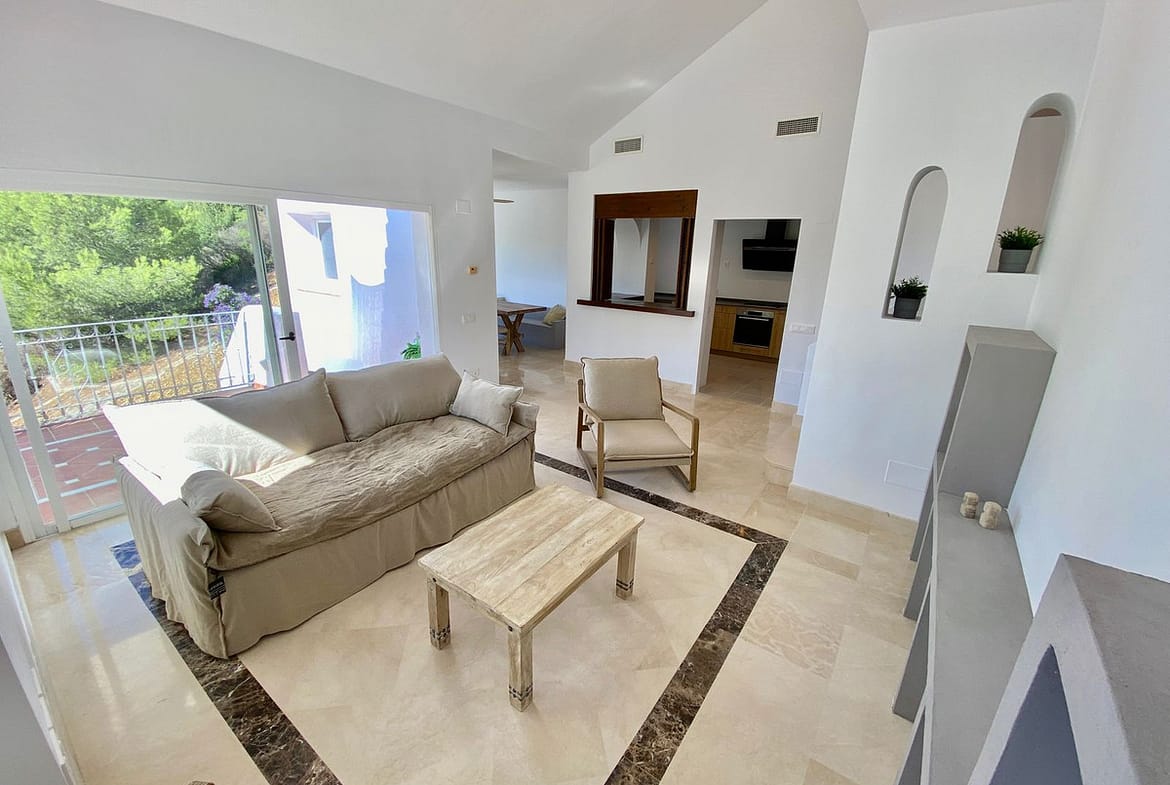 When entering this property you have the guest toilet Through the stairs you enter the spacious living room with separate dining area. With opening the sliding doors you reach the terrace.