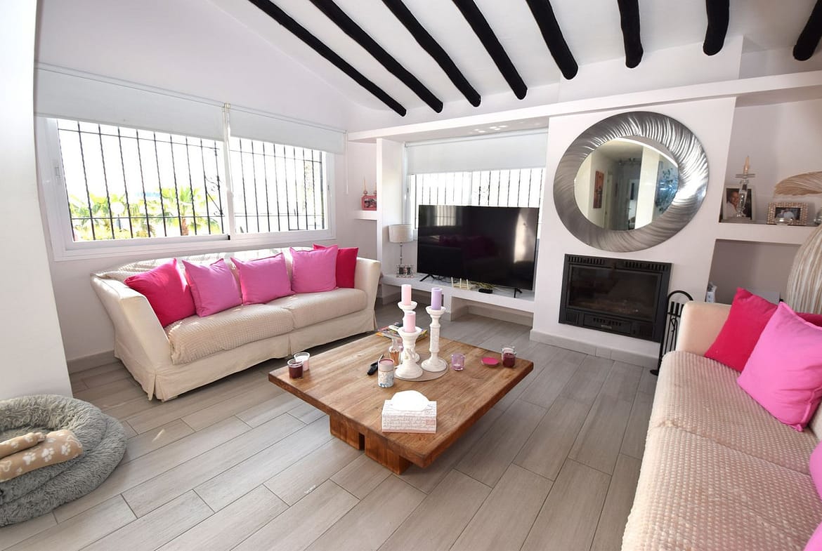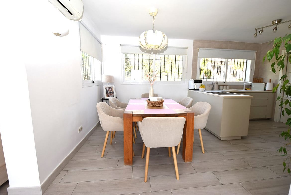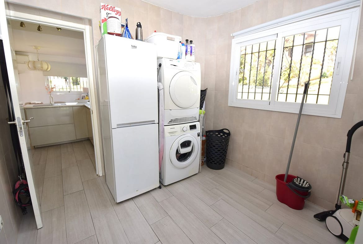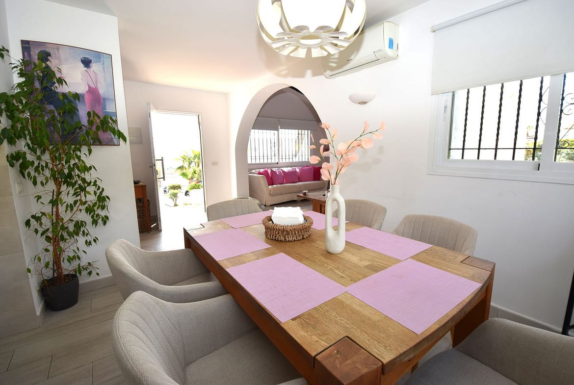 Rarely available single level villa, perfect as a holiday home or a permanent residence. Located in one of the first communities built around La Cala, currently with no restrictions on short term holiday rentals. The property was completely renovated by the present owners in 2016 and is distributed as follows; entrance hall with TV lounge and fireplace on your left as you enter the property. In front of you is the welcoming dining area and to the right you have the fully fitted open plan kitchen. An abundance of natural light flood this area thanks to the large, modern windows and behind the kitchen you have the spacious utility room with washing machine, dryer and access to the rear drying terrace and garden. In front of the kitchen you have the hallway that leads to all three double bedrooms, each with individual hot and cold air conditioning, the master bedroom with an ensuite shower room and the second shower room services both guest bedrooms. The villa is located in a fenced, corner plot which is mostly laid to lawn with a variety of flowers, hedge rows and bushes throughout the garden. The communal swimming pool and children's pool are just a couple of minutes walk away in the centre of the community and, like the villa itself, benefit from all day sun.