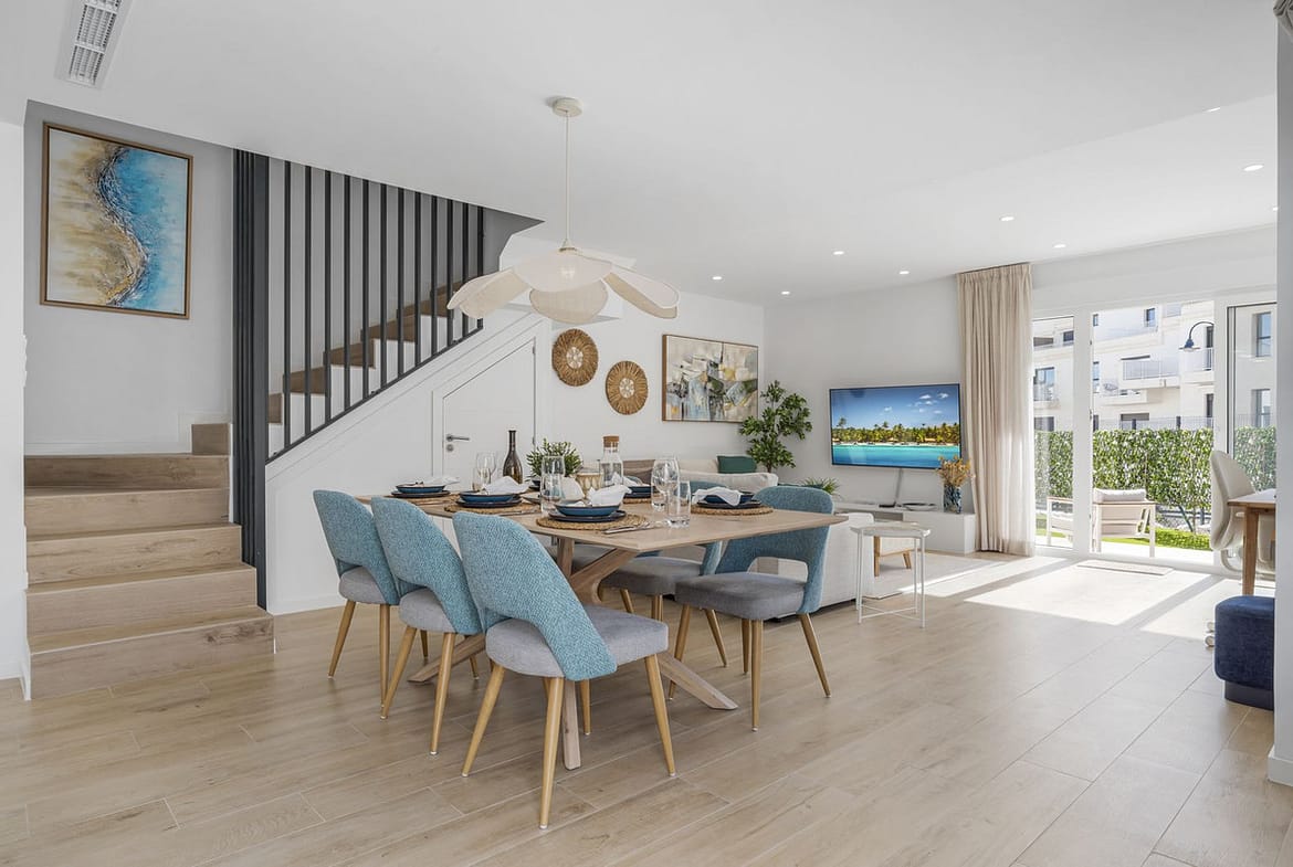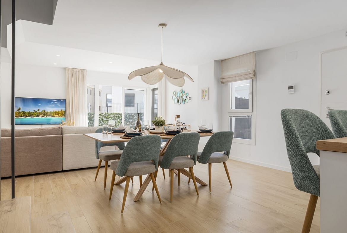Enter the spacious open plan living area with kitchen, dining area, living room and access to the patio and private garden. The kitchen is fully equipped with all appliances, a separate utility area with washer and tumble dryer and there is a downstairs wc. Family time is spent together in this fully connected space, around the breakfast bar and dining table or on the large comfy sofa area with big screen TV or playing games, this is a welcoming and comfy space to enjoy time well spent with family or friends. Upstairs we have 3 bedrooms, the master suite with ensuite and private sea view terrace, a further spacious double bedroom and a comfortable twin room shares the family bathroom with walk in shower. All the bedrooms are light and bright with the modern coastal vibe that runs through the house