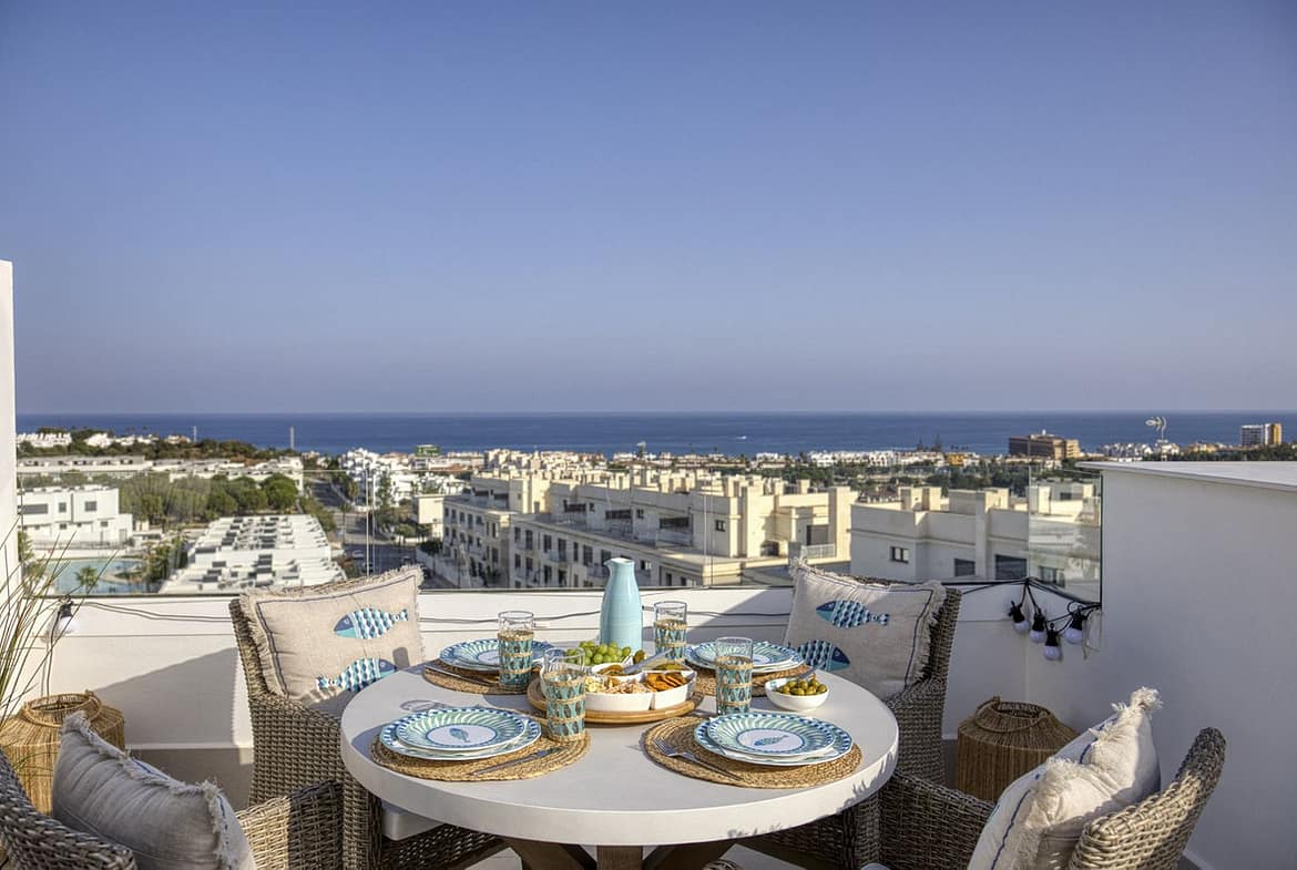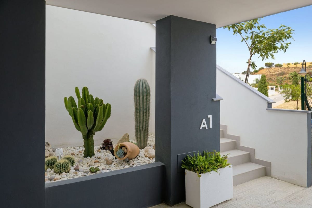 Every floor offers stunning sea views. The beach is just under a kilometer away via a nearly flat and relaxed walk. Within a few hundred meters, you will find grocery stores, a health center, charming cafés, and fine dining in La Cala de Mijas. Golf lovers will appreciate that La Noria Golf Resort is only 700 meters away, along with several other popular courses nearby.